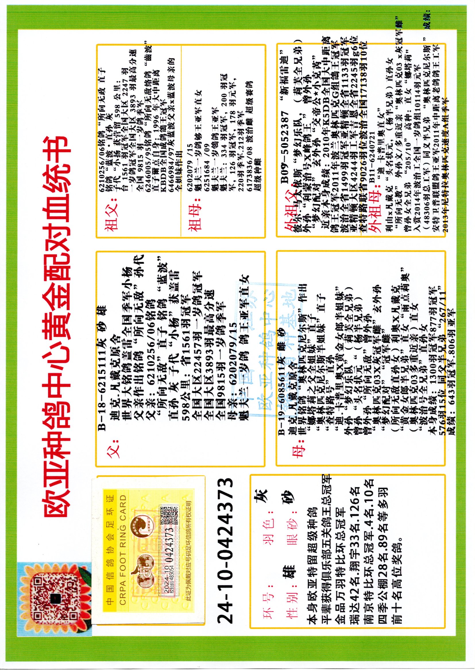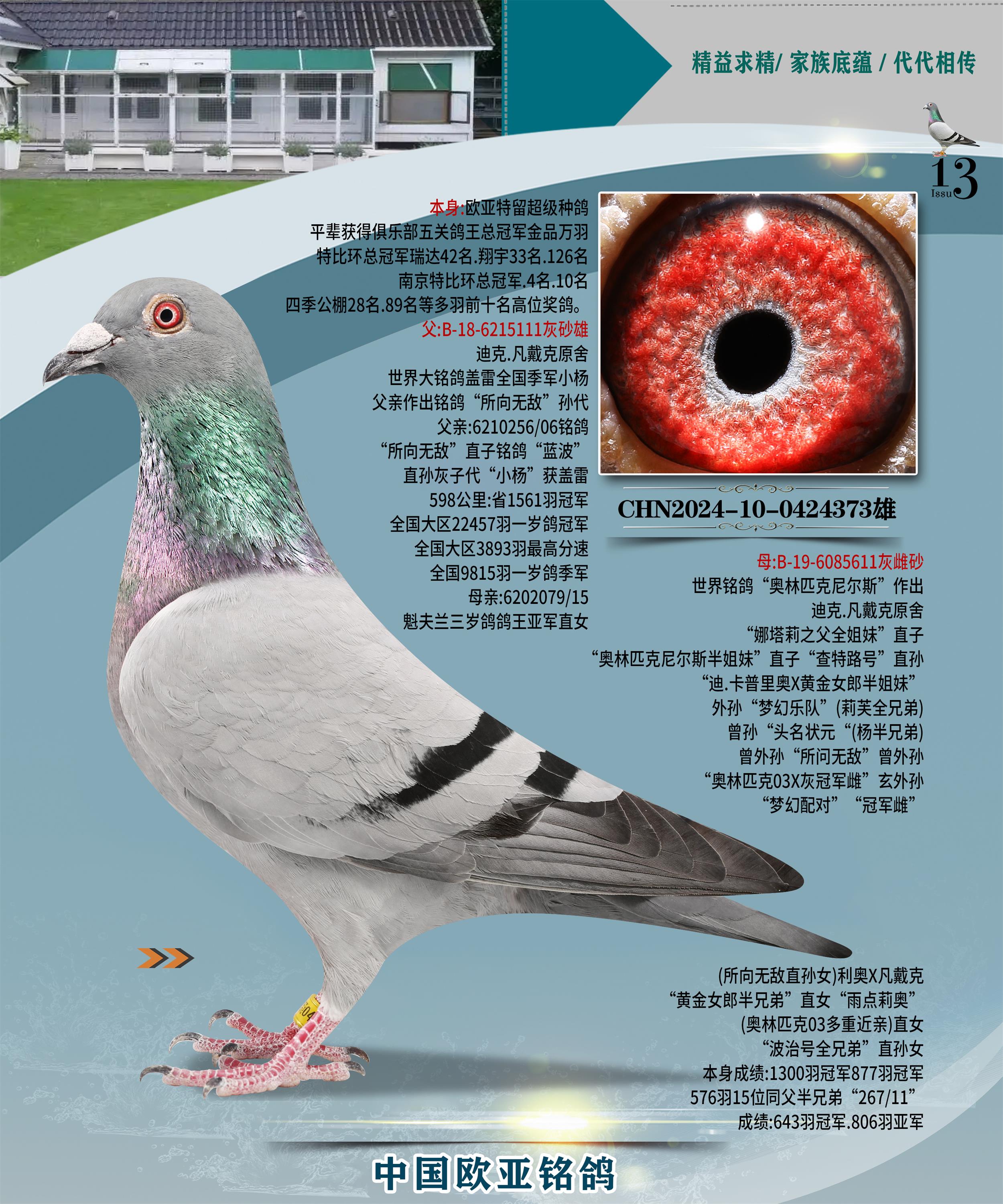 24年秋南京特比环欧亚荣获大团体冠军.小团体冠军551公里大特比13名.14名.16名.19名.20名.21名.24名.26名.27名.28名.42名.52名.54名.57名.65名.66名.68名.70名.71名.72名.74名.76名.80名.82名.83名.84名.85名.86名.90名.92名.110名.116名.121名.122名.128名.131名.158名.161名.164名.165名.166名.172名.174名.177名.182名.195名.196名.201名.205名.208名.210名.216名.253名.269名.275名.276名.294名.296名.299名,,24年秋云南天南铜都公棚决赛415名.天南铜都小棚决赛409名.云南玉活公棚决赛102名.490名.团体32名上笼二羽进二羽,天南铜都大棚506公里决赛445名。热烈祝贺河北省巨鹿县李兰生老师用欧亚泰山号血系连续十一年夺冠军,河北省国家赛冠军.全国季军等多次前十名高位,扬州王军王总用欧亚利奥24年春季获山东翔宇公棚决赛33名盖比53名。南京刘正龙刘总用欧亚盖比获得24年秋山东潍坊国际公棚决赛42名.精英赛30名.三关鸽王71名.决赛86名.加站赛16名.南京市特比环A组鸽王9名.B组鸽王5名.6名.C组鸽王5名.精英赛冠军4名.技能赛A组冠军4名.5名.秦淮区特比环荣获15名.46名.48名.87名。四川西昌徐亮徐总用欧亚利奥获得凉山州聚友决赛177名.第二关亚军双关鸽王19名.三关鸽王105名.云南豪庭公棚决赛603名。热烈祝贺24年四川重庆翔园鸽舍用欧亚泰山号荣获春季400公里冠军.秋季500公里冠军,河北王总用詹森X利奥获得千羽千翔公棚400公里冠军,广东蔡楷焕荣获24年秋爱好者 赛鸽俱乐部三关鸽王季军.一关420公里99名.二关450公里11名.三关520公里32名.单关季军.7名.12名,江西李卫兴荣获贵州红枫公棚8名.共翔俱乐部寄养棚四关综合鸽王30名.一关400公里78名.二关500公里55名.三关520公里37名.四关500公里57名.同父母获公棚18名.雷鸣获得武汉黄浦育翔中心冠军,四川陈文获得四川明鸿俱乐部300公里梦幻2名.3名.4名.9名.10名.13名.14名.15名.31名.34名.40名.41名.42名.43名.69名.71名.72名.73名.74名.94名.95名.97名.98名.99名.419公里决赛荣获总冠军7名.总共归巢9羽,四川徐亮获豪庭决赛603名,山西郑勇获得山西泰鑫公棚决赛255名詹森红狐,热烈祝贺马总获得开尔(飞跃队)决赛9名获奖金1310000万元.第一关52名,天津津福资赛180公里96名.获奖金429543万元,欧亚支持全国鸽友24年秋多人报喜 祝大家取得更好成绩,给欧亚报喜鸽友欧亚决定给每人赠送一羽超级种鸽。欧亚俱乐部特比环多关鸽王成绩:15年秋淮安特比环黑色星期一全会上笼9700多羽,当天无鸽归巢,第二天全会归巢357羽,本舍归巢158羽.前十名八羽.前一百名归巢57羽,16年春季获五关鸽王总冠军,总亚军四名.六名.七名.九名.十名.晶艺俱乐部520公里冠亚季军5名.6名.7名.9名.11名等,火车头冠军.季军6名.8名.9名.10名,16年秋晶艺俱乐部特比环520公里亚军.季军4名.6名.7名.9名,15年春南京白下特比环冠军.亚军.季军6名.7名.8名.9名.10名.指定鸽A B组获得冠军.亚军.季军4名.5名.,17年淮安特比环亚军.4名.5名.7名.8名.10名.六关鸽王总冠军.4名.6名.9名.10名,寄养棚宿迁刘总20羽特比环获冠军.季军.4名.7名.8名.9名等。18年荣获万羽特比环六关鸽王总冠军.总亚军.总季军.6名.8名.十名.单关四羽冠军.二羽亚军.四羽季军.前十名27羽。19年秋万羽特比环六关鸽王总亚军.总季军.5名.8名等,单关二羽冠军.三羽亚军.一羽季军前十名31羽。20年秋淮安市鸽会四关特比环大赛风雨无阻鸽王亚军.鸽王六名,金品俱乐部万羽特比环六关鸽王总冠军,总亚军.四名.五名.六名.七名.八名.十名.前二百名鸽王35羽,单关冠亚季军前十名四十多羽,火车头五关鸽王季军.六名.八名.前二百名鸽王十七羽。20年春荣获淮安五区一市四关鸽王总冠军.亚军.四名.八名.九名。21年秋荣获金品万羽特比环大赛六关鸽王总亚军.总季军.四名.七名.九名.十名.单关冠亚军季军前十名三十多羽。火车头协会鸽王六名.七名.十名.单关前十名十七羽。22年秋荣获鸽王总冠军.总亚军.5名.7名.8名.9名.11名.单关冠亚季军前十名三十多羽,第一关单关前二百名四十多羽,第二关前二百名三十多羽,第三关前二百名四十多羽,第四关前二百名四十多羽,第五关前一百名53羽。23年秋荣获鸽王季军.五名.八名.十名.13名.17名.20名.27名等多羽鸽王.单关前十名二十多羽。公棚.寄养棚部分成绩:16年秋宁夏黄河公棚总冠军电脑戈马力指定通炮冠军,17年送八羽参赛获得鸽王八名进奖四名,支持韩总荣获八名。支持鸽友荣获宁夏中卫公棚决赛总冠军.精英赛冠军,支持18年宁夏黄河公棚决赛冠军詹森X泰山。安徽鼎博寄养棚院内外四关鸽王总冠军.鸽王十七名.三十七名同窝,鸽王39名.42名.58名.67名。18年山东公棚预赛冠军.决赛65名.送八羽进奖五羽.指定获奔驰汽车一辆。支持鸽友获得云南蓝云公棚冠军.盖比X佛卡门。支持鸽友荣获云南银集公棚决赛冠军 詹森427X520血系 速度赛6700羽冠军。17年荣获金马俱乐部寄养棚四关鸽王总冠军.季军.六名.八名.第一关冠军.亚军.季军四名.七名.十一名.金牌教练奖。支持鸽友18年北京费翔公棚预赛九名电脑X桑杰士,支持鸽友荣获陕西威力公棚决赛11名.内蒙古临河寄养棚四关鸽王六名.詹森配泰山,支持河北王总用欧亚詹森427配胡本喜获20年秋开尔青年棚季军。云南东荣公棚16年预赛冠军.决赛77名.17年决赛12名.詹森红狐X泰山,17年平安公棚决赛4名 詹森427。欧亚获得21年金母寄养棚第一关四名.第二关5名.第三关5名.6名.7名.10名.三关鸽王总冠军,四关鸽王14名.十羽鸽王。支持河