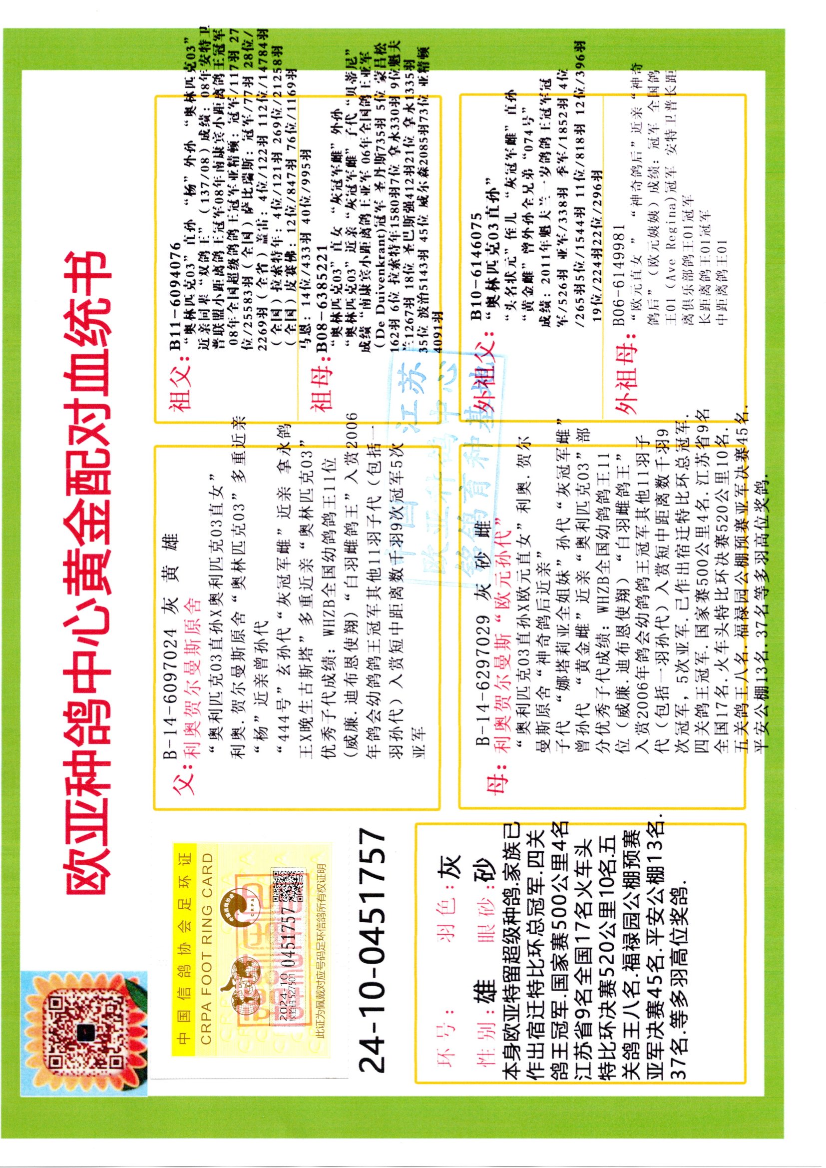 24年秋南京特比环欧亚荣获大团体冠军.小团体冠军551公里大特比13名.14名.16名.19名.20名.21名.24名.26名.27名.28名.42名.52名.54名.57名.65名.66名.68名.70名.71名.72名.74名.76名.80名.82名.83名.84名.85名.86名.90名.92名.110名.116名.121名.122名.128名.131名.158名.161名.164名.165名.166名.172名.174名.177名.182名.195名.196名.201名.205名.208名.210名.216名.253名.269名.275名.276名.294名.296名.299名,,24年秋云南天南铜都公棚决赛415名.天南铜都小棚决赛409名.云南玉活公棚决赛102名.490名.团体32名上笼二羽进二羽,天南铜都大棚506公里决赛445名。热烈祝贺河北省巨鹿县李兰生老师用欧亚泰山号血系连续十一年夺冠军,河北省国家赛冠军.全国季军等多次前十名高位,扬州王军王总用欧亚利奥24年春季获山东翔宇公棚决赛33名盖比53名。南京刘正龙刘总用欧亚盖比获得24年秋山东潍坊国际公棚决赛42名.精英赛30名.三关鸽王71名.决赛86名.加站赛16名.南京市特比环A组鸽王9名.B组鸽王5名.6名.C组鸽王5名.精英赛冠军4名.技能赛A组冠军4名.5名.秦淮区特比环荣获15名.46名.48名.87名。四川西昌徐亮徐总用欧亚利奥获得凉山州聚友决赛177名.第二关亚军双关鸽王19名.三关鸽王105名.云南豪庭公棚决赛603名。热烈祝贺24年四川重庆翔园鸽舍用欧亚泰山号荣获春季400公里冠军.秋季500公里冠军,河北王总用詹森X利奥获得千羽千翔公棚400公里冠军,广东蔡楷焕荣获24年秋爱好者 赛鸽俱乐部三关鸽王季军.一关420公里99名.二关450公里11名.三关520公里32名.单关季军.7名.12名,江西李卫兴荣获贵州红枫公棚8名.共翔俱乐部寄养棚四关综合鸽王30名.一关400公里78名.二关500公里55名.三关520公里37名.四关500公里57名.同父母获公棚18名.雷鸣获得武汉黄浦育翔中心冠军,四川陈文获得四川明鸿俱乐部300公里梦幻2名.3名.4名.9名.10名.13名.14名.15名.31名.34名.40名.41名.42名.43名.69名.71名.72名.73名.74名.94名.95名.97名.98名.99名.419公里决赛荣获总冠军7名.总共归巢9羽,四川徐亮获豪庭决赛603名,山西郑勇获得山西泰鑫公棚决赛255名詹森红狐,热烈祝贺马总获得开尔(飞跃队)决赛9名获奖金1310000万元.第一关52名,天津津福资赛180公里96名.获奖金429543万元,欧亚支持全国鸽友24年秋多人报喜 祝大家取得更好成绩,给欧亚报喜鸽友欧亚决定给每人赠送一羽超级种鸽。欧亚俱乐部特比环多关鸽王成绩:15年秋淮安特比环黑色星期一全会上笼9700多羽,当天无鸽归巢,第二天全会归巢357羽,本舍归巢158羽.前十名八羽.前一百名归巢57羽,16年春季获五关鸽王总冠军,总亚军四名.六名.七名.九名.十名.晶艺俱乐部520公里冠亚季军5名.6名.7名.9名.11名等,火车头冠军.季军6名.8名.9名.10名,16年秋晶艺俱乐部特比环520公里亚军.季军4名.6名.7名.9名,15年春南京白下特比环冠军.亚军.季军6名.7名.8名.9名.10名.指定鸽A B组获得冠军.亚军.季军4名.5名.,17年淮安特比环亚军.4名.5名.7名.8名.10名.六关鸽王总冠军.4名.6名.9名.10名,寄养棚宿迁刘总20羽特比环获冠军.季军.4名.7名.8名.9名等。18年荣获万羽特比环六关鸽王总冠军.总亚军.总季军.6名.8名.十名.单关四羽冠军.二羽亚军.四羽季军.前十名27羽。19年秋万羽特比环六关鸽王总亚军.总季军.5名.8名等,单关二羽冠军.三羽亚军.一羽季军前十名31羽。20年秋淮安市鸽会四关特比环大赛风雨无阻鸽王亚军.鸽王六名,金品俱乐部万羽特比环六关鸽王总冠军,总亚军.四名.五名.六名.七名.八名.十名.前二百名鸽王35羽,单关冠亚季军前十名四十多羽,火车头五关鸽王季军.六名.八名.前二百名鸽王十七羽。20年春荣获淮安五区一市四关鸽王总冠军.亚军.四名.八名.九名。21年秋荣获金品万羽特比环大赛六关鸽王总亚军.总季军.四名.七名.九名.十名.单关冠亚军季军前十名三十多羽。火车头协会鸽王六名.七名.十名.单关前十名十七羽。22年秋荣获鸽王总冠军.总亚军.5名.7名.8名.9名.11名.单关冠亚季军前十名三十多羽,第一关单关前二百名四十多羽,第二关前二百名三十多羽,第三关前二百名四十多羽,第四关前二百名四十多羽,第五关前一百名53羽。23年秋荣获鸽王季军.五名.八名.十名.13名.17名.20名.27名等多羽鸽王.单关前十名二十多羽。公棚.寄养棚部分成绩:16年秋宁夏黄河公棚总冠军电脑戈马力指定通炮冠军,17年送八羽参赛获得鸽王八名进奖四名,支持韩总荣获八名。支持鸽友荣获宁夏中卫公棚决赛总冠军.精英赛冠军,支持18年宁夏黄河公棚决赛冠军詹森X泰山。安徽鼎博寄养棚院内外四关鸽王总冠军.鸽王十七名.三十七名同窝,鸽王39名.42名.58名.67名。18年山东公棚预赛冠军.决赛65名.送八羽进奖五羽.指定获奔驰汽车一辆。支持鸽友获得云南蓝云公棚冠军.盖比X佛卡门。支持鸽友荣获云南银集公棚决赛冠军 詹森427X520血系 速度赛6700羽冠军。17年荣获金马俱乐部寄养棚四关鸽王总冠军.季军.六名.八名.第一关冠军.亚军.季军四名.七名.十一名.金牌教练奖。支持鸽友18年北京费翔公棚预赛九名电脑X桑杰士,支持鸽友荣获陕西威力公棚决赛11名.内蒙古临河寄养棚四关鸽王六名.詹森配泰山,支持河北王总用欧亚詹森427配胡本喜获20年秋开尔青年棚季军。云南东荣公棚16年预赛冠军.决赛77名.17年决赛12名.詹森红狐X泰山,17年平安公棚决赛4名 詹森427。欧亚获得21年金母寄养棚第一关四名.第二关5名.第三关5名.6名.7名.10名.三关鸽王总冠军,四关鸽王14名.十羽鸽王。支持河