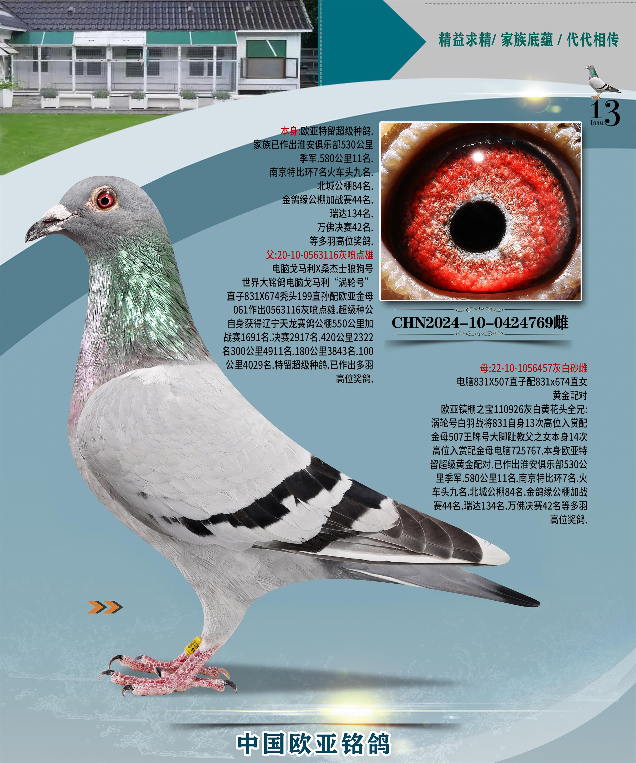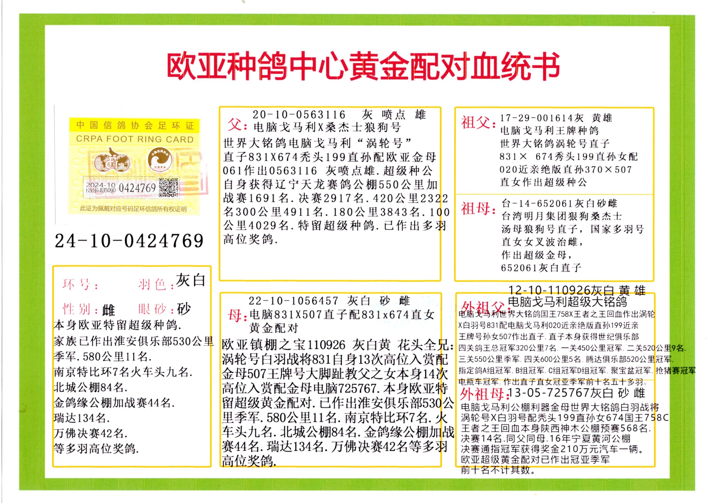 24年秋南京特比环欧亚荣获大团体冠军.小团体冠军551公里大特比13名.14名.16名.19名.20名.21名.24名.26名.27名.28名.42名.52名.54名.57名.65名.66名.68名.70名.71名.72名.74名.76名.80名.82名.83名.84名.85名.86名.90名.92名.110名.116名.121名.122名.128名.131名.158名.161名.164名.165名.166名.172名.174名.177名.182名.195名.196名.201名.205名.208名.210名.216名.253名.269名.275名.276名.294名.296名.299名,,24年秋云南天南铜都公棚决赛415名.天南铜都小棚决赛409名.云南玉活公棚决赛102名.490名.团体32名上笼二羽进二羽,天南铜都大棚506公里决赛445名。热烈祝贺河北省巨鹿县李兰生老师用欧亚泰山号血系连续十一年夺冠军,河北省国家赛冠军.全国季军等多次前十名高位,扬州王军王总用欧亚利奥24年春季获山东翔宇公棚决赛33名盖比53名。南京刘正龙刘总用欧亚盖比获得24年秋山东潍坊国际公棚决赛42名.精英赛30名.三关鸽王71名.决赛86名.加站赛16名.南京市特比环A组鸽王9名.B组鸽王5名.6名.C组鸽王5名.精英赛冠军4名.技能赛A组冠军4名.5名.秦淮区特比环荣获15名.46名.48名.87名。四川西昌徐亮徐总用欧亚利奥获得凉山州聚友决赛177名.第二关亚军双关鸽王19名.三关鸽王105名.云南豪庭公棚决赛603名。热烈祝贺24年四川重庆翔园鸽舍用欧亚泰山号荣获春季400公里冠军.秋季500公里冠军,河北王总用詹森X利奥获得千羽千翔公棚400公里冠军,广东蔡楷焕荣获24年秋爱好者 赛鸽俱乐部三关鸽王季军.一关420公里99名.二关450公里11名.三关520公里32名.单关季军.7名.12名,江西李卫兴荣获贵州红枫公棚8名.共翔俱乐部寄养棚四关综合鸽王30名.一关400公里78名.二关500公里55名.三关520公里37名.四关500公里57名.同父母获公棚18名.雷鸣获得武汉黄浦育翔中心冠军,四川陈文获得四川明鸿俱乐部300公里梦幻2名.3名.4名.9名.10名.13名.14名.15名.31名.34名.40名.41名.42名.43名.69名.71名.72名.73名.74名.94名.95名.97名.98名.99名.419公里决赛荣获总冠军7名.总共归巢9羽,四川徐亮获豪庭决赛603名,山西郑勇获得山西泰鑫公棚决赛255名詹森红狐,热烈祝贺马总获得开尔(飞跃队)决赛9名获奖金1310000万元.第一关52名,天津津福资赛180公里96名.获奖金429543万元,欧亚支持全国鸽友24年秋多人报喜 祝大家取得更好成绩,给欧亚报喜鸽友欧亚决定给每人赠送一羽超级种鸽。欧亚俱乐部特比环多关鸽王成绩:15年秋淮安特比环黑色星期一全会上笼9700多羽,当天无鸽归巢,第二天全会归巢357羽,本舍归巢158羽.前十名八羽.前一百名归巢57羽,16年春季获五关鸽王总冠军,总亚军四名.六名.七名.九名.十名.晶艺俱乐部520公里冠亚季军5名.6名.7名.9名.11名等,火车头冠军.季军6名.8名.9名.10名,16年秋晶艺俱乐部特比环520公里亚军.季军4名.6名.7名.9名,15年春南京白下特比环冠军.亚军.季军6名.7名.8名.9名.10名.指定鸽A B组获得冠军.亚军.季军4名.5名.,17年淮安特比环亚军.4名.5名.7名.8名.10名.六关鸽王总冠军.4名.6名.9名.10名,寄养棚宿迁刘总20羽特比环获冠军.季军.4名.7名.8名.9名等。18年荣获万羽特比环六关鸽王总冠军.总亚军.总季军.6名.8名.十名.单关四羽冠军.二羽亚军.四羽季军.前十名27羽。19年秋万羽特比环六关鸽王总亚军.总季军.5名.8名等,单关二羽冠军.三羽亚军.一羽季军前十名31羽。20年秋淮安市鸽会四关特比环大赛风雨无阻鸽王亚军.鸽王六名,金品俱乐部万羽特比环六关鸽王总冠军,总亚军.四名.五名.六名.七名.八名.十名.前二百名鸽王35羽,单关冠亚季军前十名四十多羽,火车头五关鸽王季军.六名.八名.前二百名鸽王十七羽。20年春荣获淮安五区一市四关鸽王总冠军.亚军.四名.八名.九名。21年秋荣获金品万羽特比环大赛六关鸽王总亚军.总季军.四名.七名.九名.十名.单关冠亚军季军前十名三十多羽。火车头协会鸽王六名.七名.十名.单关前十名十七羽。22年秋荣获鸽王总冠军.总亚军.5名.7名.8名.9名.11名.单关冠亚季军前十名三十多羽,第一关单关前二百名四十多羽,第二关前二百名三十多羽,第三关前二百名四十多羽,第四关前二百名四十多羽,第五关前一百名53羽。23年秋荣获鸽王季军.五名.八名.十名.13名.17名.20名.27名等多羽鸽王.单关前十名二十多羽。公棚.寄养棚部分成绩:16年秋宁夏黄河公棚总冠军电脑戈马力指定通炮冠军,17年送八羽参赛获得鸽王八名进奖四名,支持韩总荣获八名。支持鸽友荣获宁夏中卫公棚决赛总冠军.精英赛冠军,支持18年宁夏黄河公棚决赛冠军詹森X泰山。安徽鼎博寄养棚院内外四关鸽王总冠军.鸽王十七名.三十七名同窝,鸽王39名.42名.58名.67名。18年山东公棚预赛冠军.决赛65名.送八羽进奖五羽.指定获奔驰汽车一辆。支持鸽友获得云南蓝云公棚冠军.盖比X佛卡门。支持鸽友荣获云南银集公棚决赛冠军 詹森427X520血系 速度赛6700羽冠军。17年荣获金马俱乐部寄养棚四关鸽王总冠军.季军.六名.八名.第一关冠军.亚军.季军四名.七名.十一名.金牌教练奖。支持鸽友18年北京费翔公棚预赛九名电脑X桑杰士,支持鸽友荣获陕西威力公棚决赛11名.内蒙古临河寄养棚四关鸽王六名.詹森配泰山,支持河北王总用欧亚詹森427配胡本喜获20年秋开尔青年棚季军。云南东荣公棚16年预赛冠军.决赛77名.17年决赛12名.詹森红狐X泰山,17年平安公棚决赛4名 詹森427。欧亚获得21年金母寄养棚第一关四名.第二关5名.第三关5名.6名.7名.10名.三关鸽王总冠军,四关鸽王14名.十羽鸽王。支持河