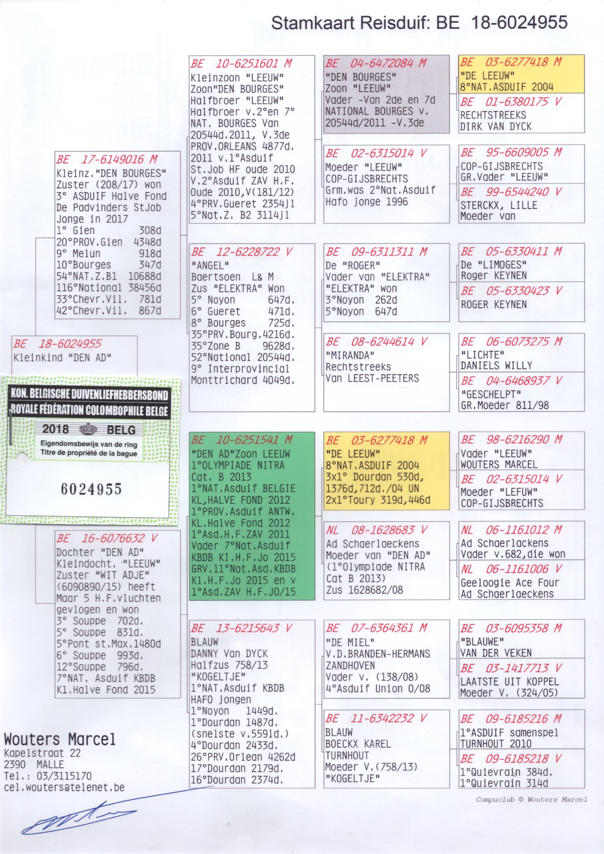 马塞尔·沃特斯的“波治号”(B04-6472084/04)是比利时赛鸽领域具有重要影响力的种鸽,其子代和孙代在多个赛事中取得优异成绩。