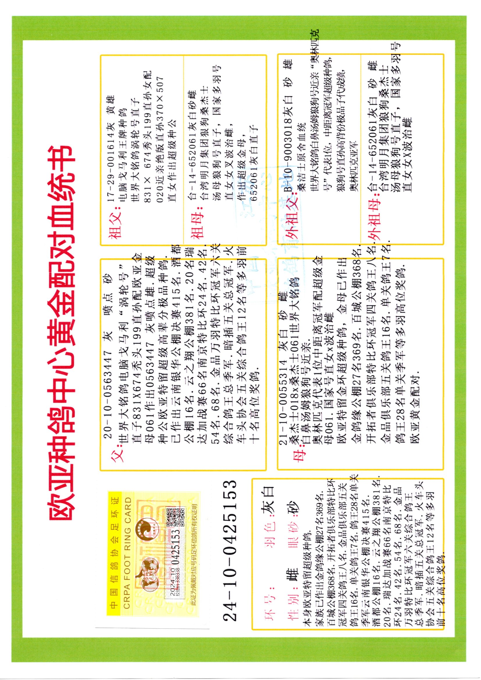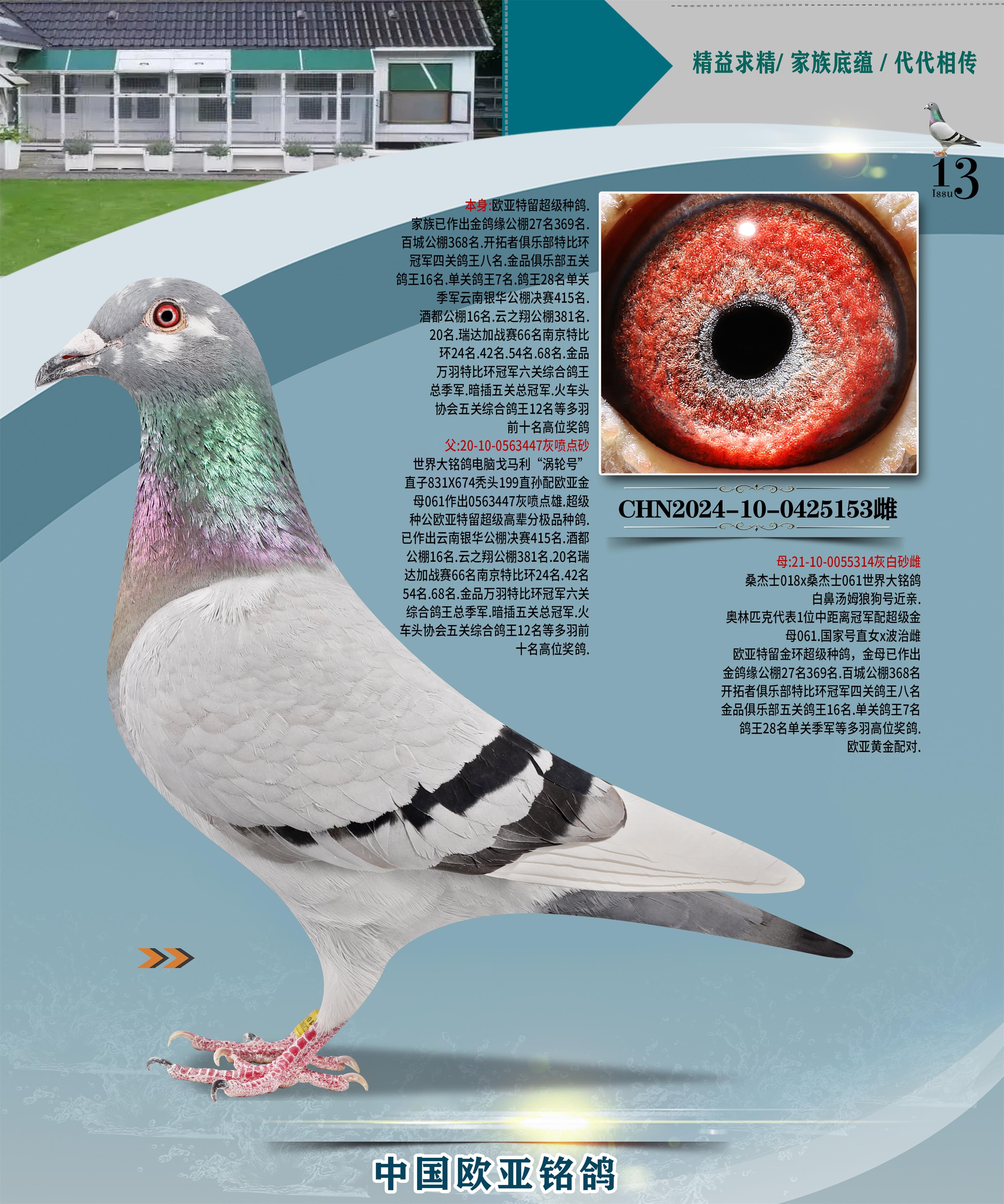 24年秋南京特比环欧亚荣获大团体冠军.小团体冠军551公里大特比13名.14名.16名.19名.20名.21名.24名.26名.27名.28名.42名.52名.54名.57名.65名.66名.68名.70名.71名.72名.74名.76名.80名.82名.83名.84名.85名.86名.90名.92名.110名.116名.121名.122名.128名.131名.158名.161名.164名.165名.166名.172名.174名.177名.182名.195名.196名.201名.205名.208名.210名.216名.253名.269名.275名.276名.294名.296名.299名,,24年秋云南天南铜都公棚决赛415名.天南铜都小棚决赛409名.云南玉活公棚决赛102名.490名.团体32名上笼二羽进二羽,天南铜都大棚506公里决赛445名。热烈祝贺河北省巨鹿县李兰生老师用欧亚泰山号血系连续十一年夺冠军,河北省国家赛冠军.全国季军等多次前十名高位,扬州王军王总用欧亚利奥24年春季获山东翔宇公棚决赛33名盖比53名。南京刘正龙刘总用欧亚盖比获得24年秋山东潍坊国际公棚决赛42名.精英赛30名.三关鸽王71名.决赛86名.加站赛16名.南京市特比环A组鸽王9名.B组鸽王5名.6名.C组鸽王5名.精英赛冠军4名.技能赛A组冠军4名.5名.秦淮区特比环荣获15名.46名.48名.87名。四川西昌徐亮徐总用欧亚利奥获得凉山州聚友决赛177名.第二关亚军双关鸽王19名.三关鸽王105名.云南豪庭公棚决赛603名。热烈祝贺24年四川重庆翔园鸽舍用欧亚泰山号荣获春季400公里冠军.秋季500公里冠军,河北王总用詹森X利奥获得千羽千翔公棚400公里冠军,广东蔡楷焕荣获24年秋爱好者 赛鸽俱乐部三关鸽王季军.一关420公里99名.二关450公里11名.三关520公里32名.单关季军.7名.12名,江西李卫兴荣获贵州红枫公棚8名.共翔俱乐部寄养棚四关综合鸽王30名.一关400公里78名.二关500公里55名.三关520公里37名.四关500公里57名.同父母获公棚18名.雷鸣获得武汉黄浦育翔中心冠军,四川陈文获得四川明鸿俱乐部300公里梦幻2名.3名.4名.9名.10名.13名.14名.15名.31名.34名.40名.41名.42名.43名.69名.71名.72名.73名.74名.94名.95名.97名.98名.99名.419公里决赛荣获总冠军7名.总共归巢9羽,四川徐亮获豪庭决赛603名,山西郑勇获得山西泰鑫公棚决赛255名詹森红狐,热烈祝贺马总获得开尔(飞跃队)决赛9名获奖金1310000万元.第一关52名,天津津福资赛180公里96名.获奖金429543万元,欧亚支持全国鸽友24年秋多人报喜 祝大家取得更好成绩,给欧亚报喜鸽友欧亚决定给每人赠送一羽超级种鸽。欧亚俱乐部特比环多关鸽王成绩:15年秋淮安特比环黑色星期一全会上笼9700多羽,当天无鸽归巢,第二天全会归巢357羽,本舍归巢158羽.前十名八羽.前一百名归巢57羽,16年春季获五关鸽王总冠军,总亚军四名.六名.七名.九名.十名.晶艺俱乐部520公里冠亚季军5名.6名.7名.9名.11名等,火车头冠军.季军6名.8名.9名.10名,16年秋晶艺俱乐部特比环520公里亚军.季军4名.6名.7名.9名,15年春南京白下特比环冠军.亚军.季军6名.7名.8名.9名.10名.指定鸽A B组获得冠军.亚军.季军4名.5名.,17年淮安特比环亚军.4名.5名.7名.8名.10名.六关鸽王总冠军.4名.6名.9名.10名,寄养棚宿迁刘总20羽特比环获冠军.季军.4名.7名.8名.9名等。18年荣获万羽特比环六关鸽王总冠军.总亚军.总季军.6名.8名.十名.单关四羽冠军.二羽亚军.四羽季军.前十名27羽。19年秋万羽特比环六关鸽王总亚军.总季军.5名.8名等,单关二羽冠军.三羽亚军.一羽季军前十名31羽。20年秋淮安市鸽会四关特比环大赛风雨无阻鸽王亚军.鸽王六名,金品俱乐部万羽特比环六关鸽王总冠军,总亚军.四名.五名.六名.七名.八名.十名.前二百名鸽王35羽,单关冠亚季军前十名四十多羽,火车头五关鸽王季军.六名.八名.前二百名鸽王十七羽。20年春荣获淮安五区一市四关鸽王总冠军.亚军.四名.八名.九名。21年秋荣获金品万羽特比环大赛六关鸽王总亚军.总季军.四名.七名.九名.十名.单关冠亚军季军前十名三十多羽。火车头协会鸽王六名.七名.十名.单关前十名十七羽。22年秋荣获鸽王总冠军.总亚军.5名.7名.8名.9名.11名.单关冠亚季军前十名三十多羽,第一关单关前二百名四十多羽,第二关前二百名三十多羽,第三关前二百名四十多羽,第四关前二百名四十多羽,第五关前一百名53羽。23年秋荣获鸽王季军.五名.八名.十名.13名.17名.20名.27名等多羽鸽王.单关前十名二十多羽。公棚.寄养棚部分成绩:16年秋宁夏黄河公棚总冠军电脑戈马力指定通炮冠军,17年送八羽参赛获得鸽王八名进奖四名,支持韩总荣获八名。支持鸽友荣获宁夏中卫公棚决赛总冠军.精英赛冠军,支持18年宁夏黄河公棚决赛冠军詹森X泰山。安徽鼎博寄养棚院内外四关鸽王总冠军.鸽王十七名.三十七名同窝,鸽王39名.42名.58名.67名。18年山东公棚预赛冠军.决赛65名.送八羽进奖五羽.指定获奔驰汽车一辆。支持鸽友获得云南蓝云公棚冠军.盖比X佛卡门。支持鸽友荣获云南银集公棚决赛冠军 詹森427X520血系 速度赛6700羽冠军。17年荣获金马俱乐部寄养棚四关鸽王总冠军.季军.六名.八名.第一关冠军.亚军.季军四名.七名.十一名.金牌教练奖。支持鸽友18年北京费翔公棚预赛九名电脑X桑杰士,支持鸽友荣获陕西威力公棚决赛11名.内蒙古临河寄养棚四关鸽王六名.詹森配泰山,支持河北王总用欧亚詹森427配胡本喜获20年秋开尔青年棚季军。云南东荣公棚16年预赛冠军.决赛77名.17年决赛12名.詹森红狐X泰山,17年平安公棚决赛4名 詹森427。欧亚获得21年金母寄养棚第一关四名.第二关5名.第三关5名.6名.7名.10名.三关鸽王总冠军,四关鸽王14名.十羽鸽王。支持河