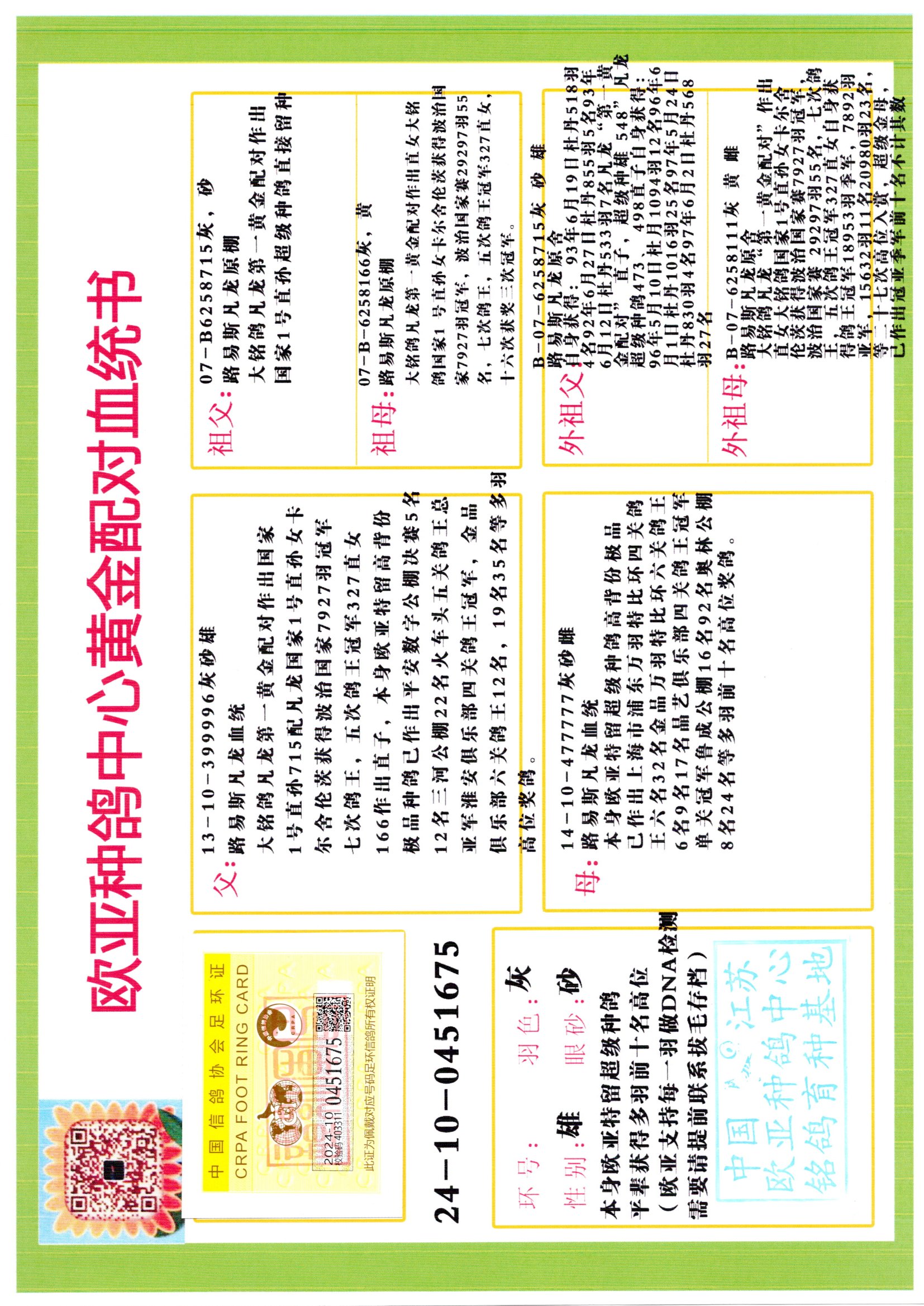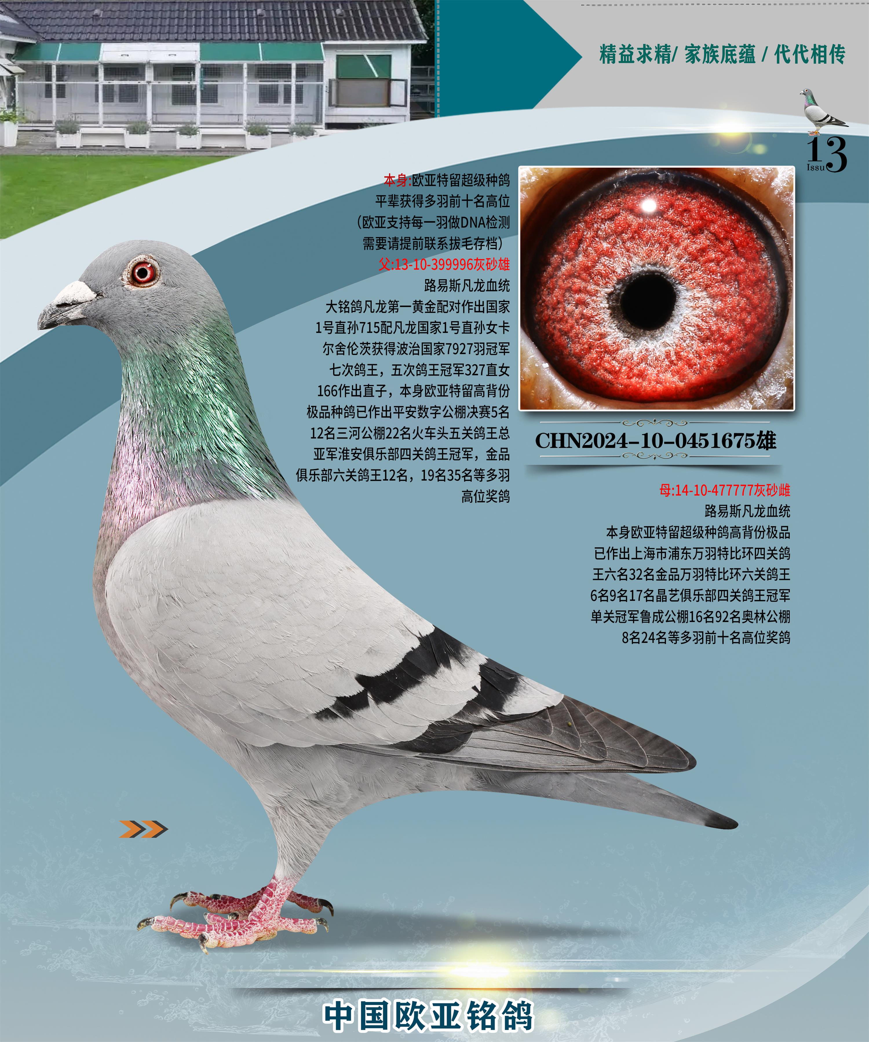 24年秋南京特比环欧亚荣获大团体冠军.小团体冠军551公里大特比13名.14名.16名.19名.20名.21名.24名.26名.27名.28名.42名.52名.54名.57名.65名.66名.68名.70名.71名.72名.74名.76名.80名.82名.83名.84名.85名.86名.90名.92名.110名.116名.121名.122名.128名.131名.158名.161名.164名.165名.166名.172名.174名.177名.182名.195名.196名.201名.205名.208名.210名.216名.253名.269名.275名.276名.294名.296名.299名,,24年秋云南天南铜都公棚决赛415名.天南铜都小棚决赛409名.云南玉活公棚决赛102名.490名.团体32名上笼二羽进二羽,天南铜都大棚506公里决赛445名。热烈祝贺河北省巨鹿县李兰生老师用欧亚泰山号血系连续十一年夺冠军,河北省国家赛冠军.全国季军等多次前十名高位,扬州王军王总用欧亚利奥24年春季获山东翔宇公棚决赛33名盖比53名。南京刘正龙刘总用欧亚盖比获得24年秋山东潍坊国际公棚决赛42名.精英赛30名.三关鸽王71名.决赛86名.加站赛16名.南京市特比环A组鸽王9名.B组鸽王5名.6名.C组鸽王5名.精英赛冠军4名.技能赛A组冠军4名.5名.秦淮区特比环荣获15名.46名.48名.87名。四川西昌徐亮徐总用欧亚利奥获得凉山州聚友决赛177名.第二关亚军双关鸽王19名.三关鸽王105名.云南豪庭公棚决赛603名。热烈祝贺24年四川重庆翔园鸽舍用欧亚泰山号荣获春季400公里冠军.秋季500公里冠军,河北王总用詹森X利奥获得千羽千翔公棚400公里冠军,广东蔡楷焕荣获24年秋爱好者 赛鸽俱乐部三关鸽王季军.一关420公里99名.二关450公里11名.三关520公里32名.单关季军.7名.12名,江西李卫兴荣获贵州红枫公棚8名.共翔俱乐部寄养棚四关综合鸽王30名.一关400公里78名.二关500公里55名.三关520公里37名.四关500公里57名.同父母获公棚18名.雷鸣获得武汉黄浦育翔中心冠军,四川陈文获得四川明鸿俱乐部300公里梦幻2名.3名.4名.9名.10名.13名.14名.15名.31名.34名.40名.41名.42名.43名.69名.71名.72名.73名.74名.94名.95名.97名.98名.99名.419公里决赛荣获总冠军7名.总共归巢9羽,四川徐亮获豪庭决赛603名,山西郑勇获得山西泰鑫公棚决赛255名詹森红狐,热烈祝贺马总获得开尔(飞跃队)决赛9名获奖金1310000万元.第一关52名,天津津福资赛180公里96名.获奖金429543万元,欧亚支持全国鸽友24年秋多人报喜 祝大家取得更好成绩,给欧亚报喜鸽友欧亚决定给每人赠送一羽超级种鸽。欧亚俱乐部特比环多关鸽王成绩:15年秋淮安特比环黑色星期一全会上笼9700多羽,当天无鸽归巢,第二天全会归巢357羽,本舍归巢158羽.前十名八羽.前一百名归巢57羽,16年春季获五关鸽王总冠军,总亚军四名.六名.七名.九名.十名.晶艺俱乐部520公里冠亚季军5名.6名.7名.9名.11名等,火车头冠军.季军6名.8名.9名.10名,16年秋晶艺俱乐部特比环520公里亚军.季军4名.6名.7名.9名,15年春南京白下特比环冠军.亚军.季军6名.7名.8名.9名.10名.指定鸽A B组获得冠军.亚军.季军4名.5名.,17年淮安特比环亚军.4名.5名.7名.8名.10名.六关鸽王总冠军.4名.6名.9名.10名,寄养棚宿迁刘总20羽特比环获冠军.季军.4名.7名.8名.9名等。18年荣获万羽特比环六关鸽王总冠军.总亚军.总季军.6名.8名.十名.单关四羽冠军.二羽亚军.四羽季军.前十名27羽。19年秋万羽特比环六关鸽王总亚军.总季军.5名.8名等,单关二羽冠军.三羽亚军.一羽季军前十名31羽。20年秋淮安市鸽会四关特比环大赛风雨无阻鸽王亚军.鸽王六名,金品俱乐部万羽特比环六关鸽王总冠军,总亚军.四名.五名.六名.七名.八名.十名.前二百名鸽王35羽,单关冠亚季军前十名四十多羽,火车头五关鸽王季军.六名.八名.前二百名鸽王十七羽。20年春荣获淮安五区一市四关鸽王总冠军.亚军.四名.八名.九名。21年秋荣获金品万羽特比环大赛六关鸽王总亚军.总季军.四名.七名.九名.十名.单关冠亚军季军前十名三十多羽。火车头协会鸽王六名.七名.十名.单关前十名十七羽。22年秋荣获鸽王总冠军.总亚军.5名.7名.8名.9名.11名.单关冠亚季军前十名三十多羽,第一关单关前二百名四十多羽,第二关前二百名三十多羽,第三关前二百名四十多羽,第四关前二百名四十多羽,第五关前一百名53羽。23年秋荣获鸽王季军.五名.八名.十名.13名.17名.20名.27名等多羽鸽王.单关前十名二十多羽。公棚.寄养棚部分成绩:16年秋宁夏黄河公棚总冠军电脑戈马力指定通炮冠军,17年送八羽参赛获得鸽王八名进奖四名,支持韩总荣获八名。支持鸽友荣获宁夏中卫公棚决赛总冠军.精英赛冠军,支持18年宁夏黄河公棚决赛冠军詹森X泰山。安徽鼎博寄养棚院内外四关鸽王总冠军.鸽王十七名.三十七名同窝,鸽王39名.42名.58名.67名。18年山东公棚预赛冠军.决赛65名.送八羽进奖五羽.指定获奔驰汽车一辆。支持鸽友获得云南蓝云公棚冠军.盖比X佛卡门。支持鸽友荣获云南银集公棚决赛冠军 詹森427X520血系 速度赛6700羽冠军。17年荣获金马俱乐部寄养棚四关鸽王总冠军.季军.六名.八名.第一关冠军.亚军.季军四名.七名.十一名.金牌教练奖。支持鸽友18年北京费翔公棚预赛九名电脑X桑杰士,支持鸽友荣获陕西威力公棚决赛11名.内蒙古临河寄养棚四关鸽王六名.詹森配泰山,支持河北王总用欧亚詹森427配胡本喜获20年秋开尔青年棚季军。云南东荣公棚16年预赛冠军.决赛77名.17年决赛12名.詹森红狐X泰山,17年平安公棚决赛4名 詹森427。欧亚获得21年金母寄养棚第一关四名.第二关5名.第三关5名.6名.7名.10名.三关鸽王总冠军,四关鸽王14名.十羽鸽王。支持河