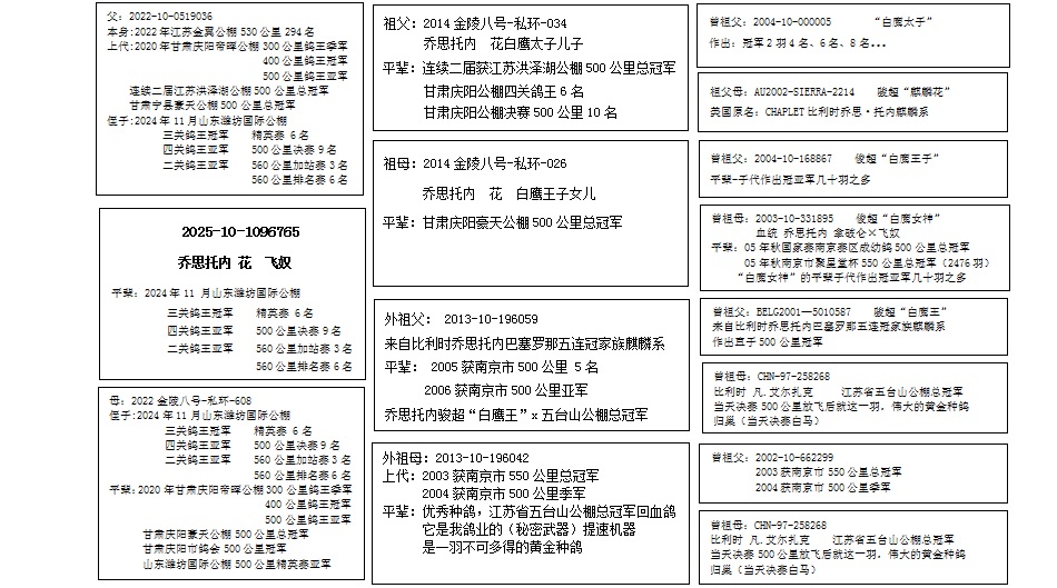 三关鸽王冠军,四关鸽王亚军,二关鸽王亚军,精英赛6名,500公里决赛9名,560公里加站赛3名,560公里排名赛6名(乔 花 飞奴)