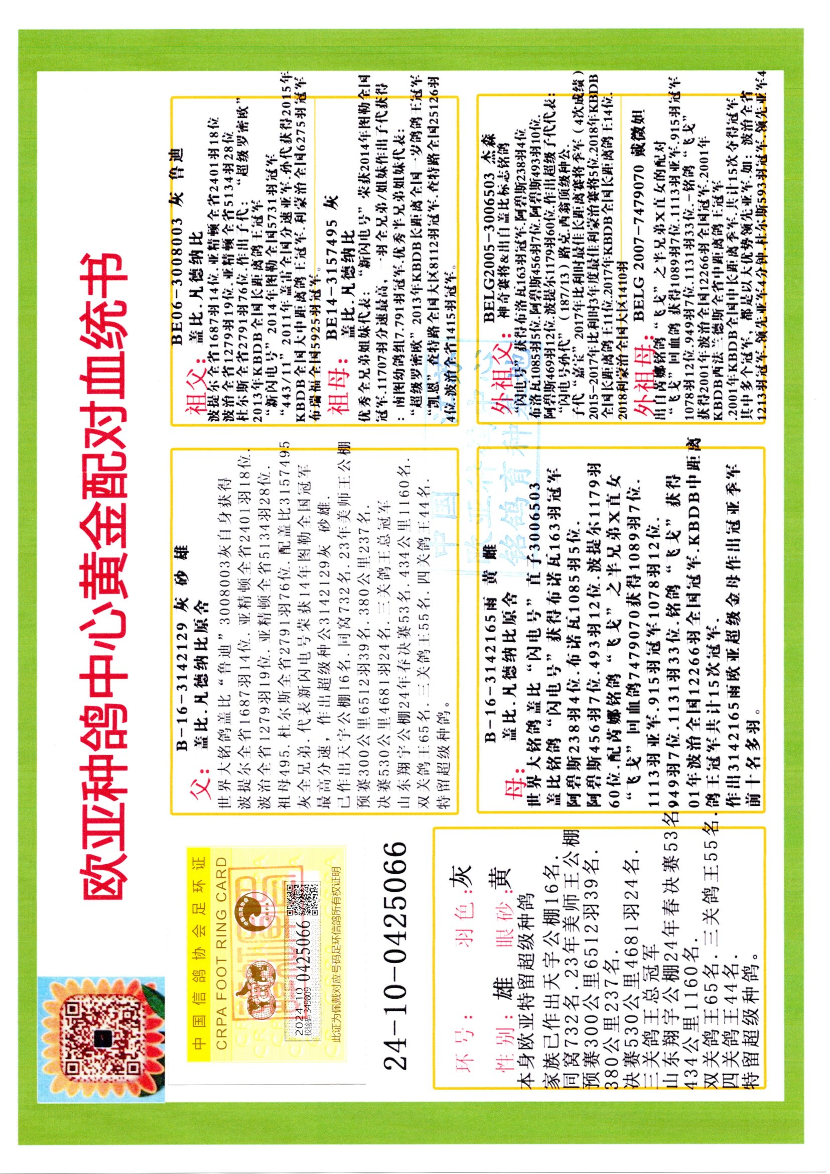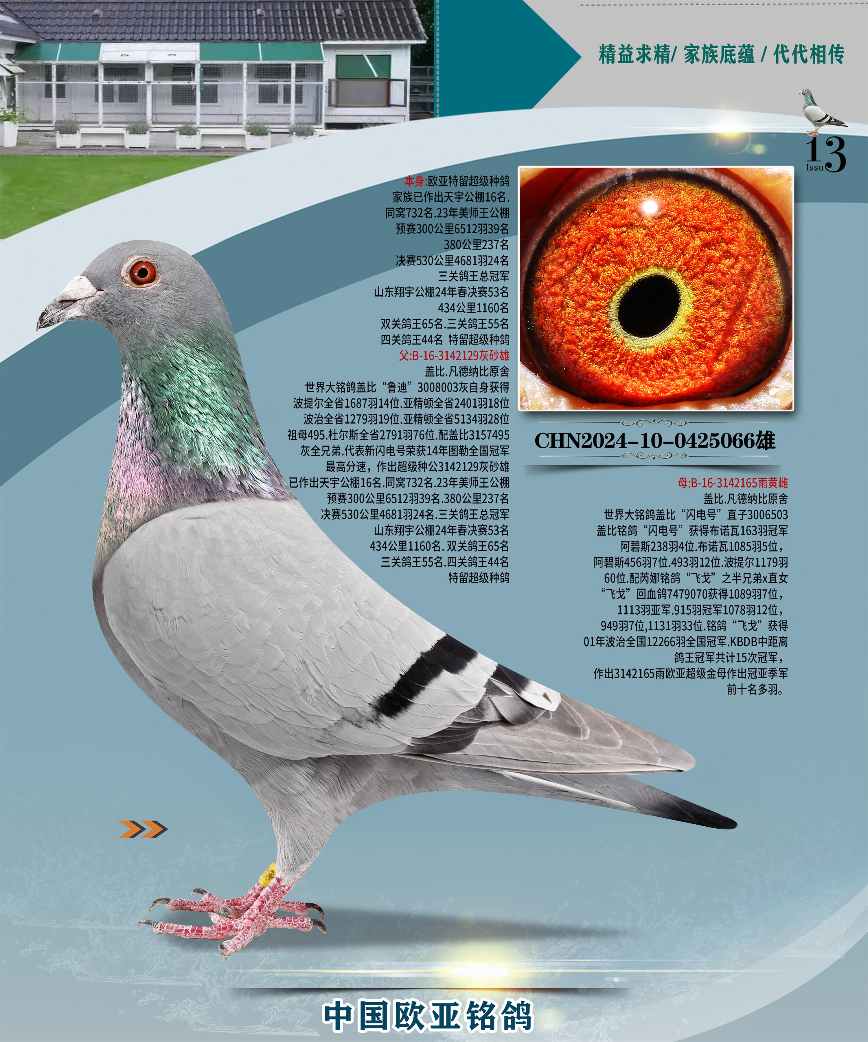 24年秋南京特比环欧亚荣获大团体冠军.小团体冠军551公里大特比13名.14名.16名.19名.20名.21名.24名.26名.27名.28名.42名.52名.54名.57名.65名.66名.68名.70名.71名.72名.74名.76名.80名.82名.83名.84名.85名.86名.90名.92名.110名.116名.121名.122名.128名.131名.158名.161名.164名.165名.166名.172名.174名.177名.182名.195名.196名.201名.205名.208名.210名.216名.253名.269名.275名.276名.294名.296名.299名,,24年秋云南天南铜都公棚决赛415名.天南铜都小棚决赛409名.云南玉活公棚决赛102名.490名.团体32名上笼二羽进二羽,天南铜都大棚506公里决赛445名。热烈祝贺河北省巨鹿县李兰生老师用欧亚泰山号血系连续十一年夺冠军,河北省国家赛冠军.全国季军等多次前十名高位,扬州王军王总用欧亚利奥24年春季获山东翔宇公棚决赛33名盖比53名。南京刘正龙刘总用欧亚盖比获得24年秋山东潍坊国际公棚决赛42名.精英赛30名.三关鸽王71名.决赛86名.加站赛16名.南京市特比环A组鸽王9名.B组鸽王5名.6名.C组鸽王5名.精英赛冠军4名.技能赛A组冠军4名.5名.秦淮区特比环荣获15名.46名.48名.87名。四川西昌徐亮徐总用欧亚利奥获得凉山州聚友决赛177名.第二关亚军双关鸽王19名.三关鸽王105名.云南豪庭公棚决赛603名。热烈祝贺24年四川重庆翔园鸽舍用欧亚泰山号荣获春季400公里冠军.秋季500公里冠军,河北王总用詹森X利奥获得千羽千翔公棚400公里冠军,广东蔡楷焕荣获24年秋爱好者 赛鸽俱乐部三关鸽王季军.一关420公里99名.二关450公里11名.三关520公里32名.单关季军.7名.12名,江西李卫兴荣获贵州红枫公棚8名.共翔俱乐部寄养棚四关综合鸽王30名.一关400公里78名.二关500公里55名.三关520公里37名.四关500公里57名.同父母获公棚18名.雷鸣获得武汉黄浦育翔中心冠军,四川陈文获得四川明鸿俱乐部300公里梦幻2名.3名.4名.9名.10名.13名.14名.15名.31名.34名.40名.41名.42名.43名.69名.71名.72名.73名.74名.94名.95名.97名.98名.99名.419公里决赛荣获总冠军7名.总共归巢9羽,四川徐亮获豪庭决赛603名,山西郑勇获得山西泰鑫公棚决赛255名詹森红狐,热烈祝贺马总获得开尔(飞跃队)决赛9名获奖金1310000万元.第一关52名,天津津福资赛180公里96名.获奖金429543万元,欧亚支持全国鸽友24年秋多人报喜 祝大家取得更好成绩,给欧亚报喜鸽友欧亚决定给每人赠送一羽超级种鸽。欧亚俱乐部特比环多关鸽王成绩:15年秋淮安特比环黑色星期一全会上笼9700多羽,当天无鸽归巢,第二天全会归巢357羽,本舍归巢158羽.前十名八羽.前一百名归巢57羽,16年春季获五关鸽王总冠军,总亚军四名.六名.七名.九名.十名.晶艺俱乐部520公里冠亚季军5名.6名.7名.9名.11名等,火车头冠军.季军6名.8名.9名.10名,16年秋晶艺俱乐部特比环520公里亚军.季军4名.6名.7名.9名,15年春南京白下特比环冠军.亚军.季军6名.7名.8名.9名.10名.指定鸽A B组获得冠军.亚军.季军4名.5名.,17年淮安特比环亚军.4名.5名.7名.8名.10名.六关鸽王总冠军.4名.6名.9名.10名,寄养棚宿迁刘总20羽特比环获冠军.季军.4名.7名.8名.9名等。18年荣获万羽特比环六关鸽王总冠军.总亚军.总季军.6名.8名.十名.单关四羽冠军.二羽亚军.四羽季军.前十名27羽。19年秋万羽特比环六关鸽王总亚军.总季军.5名.8名等,单关二羽冠军.三羽亚军.一羽季军前十名31羽。20年秋淮安市鸽会四关特比环大赛风雨无阻鸽王亚军.鸽王六名,金品俱乐部万羽特比环六关鸽王总冠军,总亚军.四名.五名.六名.七名.八名.十名.前二百名鸽王35羽,单关冠亚季军前十名四十多羽,火车头五关鸽王季军.六名.八名.前二百名鸽王十七羽。20年春荣获淮安五区一市四关鸽王总冠军.亚军.四名.八名.九名。21年秋荣获金品万羽特比环大赛六关鸽王总亚军.总季军.四名.七名.九名.十名.单关冠亚军季军前十名三十多羽。火车头协会鸽王六名.七名.十名.单关前十名十七羽。22年秋荣获鸽王总冠军.总亚军.5名.7名.8名.9名.11名.单关冠亚季军前十名三十多羽,第一关单关前二百名四十多羽,第二关前二百名三十多羽,第三关前二百名四十多羽,第四关前二百名四十多羽,第五关前一百名53羽。23年秋荣获鸽王季军.五名.八名.十名.13名.17名.20名.27名等多羽鸽王.单关前十名二十多羽。公棚.寄养棚部分成绩:16年秋宁夏黄河公棚总冠军电脑戈马力指定通炮冠军,17年送八羽参赛获得鸽王八名进奖四名,支持韩总荣获八名。支持鸽友荣获宁夏中卫公棚决赛总冠军.精英赛冠军,支持18年宁夏黄河公棚决赛冠军詹森X泰山。安徽鼎博寄养棚院内外四关鸽王总冠军.鸽王十七名.三十七名同窝,鸽王39名.42名.58名.67名。18年山东公棚预赛冠军.决赛65名.送八羽进奖五羽.指定获奔驰汽车一辆。支持鸽友获得云南蓝云公棚冠军.盖比X佛卡门。支持鸽友荣获云南银集公棚决赛冠军 詹森427X520血系 速度赛6700羽冠军。17年荣获金马俱乐部寄养棚四关鸽王总冠军.季军.六名.八名.第一关冠军.亚军.季军四名.七名.十一名.金牌教练奖。支持鸽友18年北京费翔公棚预赛九名电脑X桑杰士,支持鸽友荣获陕西威力公棚决赛11名.内蒙古临河寄养棚四关鸽王六名.詹森配泰山,支持河北王总用欧亚詹森427配胡本喜获20年秋开尔青年棚季军。云南东荣公棚16年预赛冠军.决赛77名.17年决赛12名.詹森红狐X泰山,17年平安公棚决赛4名 詹森427。欧亚获得21年金母寄养棚第一关四名.第二关5名.第三关5名.6名.7名.10名.三关鸽王总冠军,四关鸽王14名.十羽鸽王。支持河