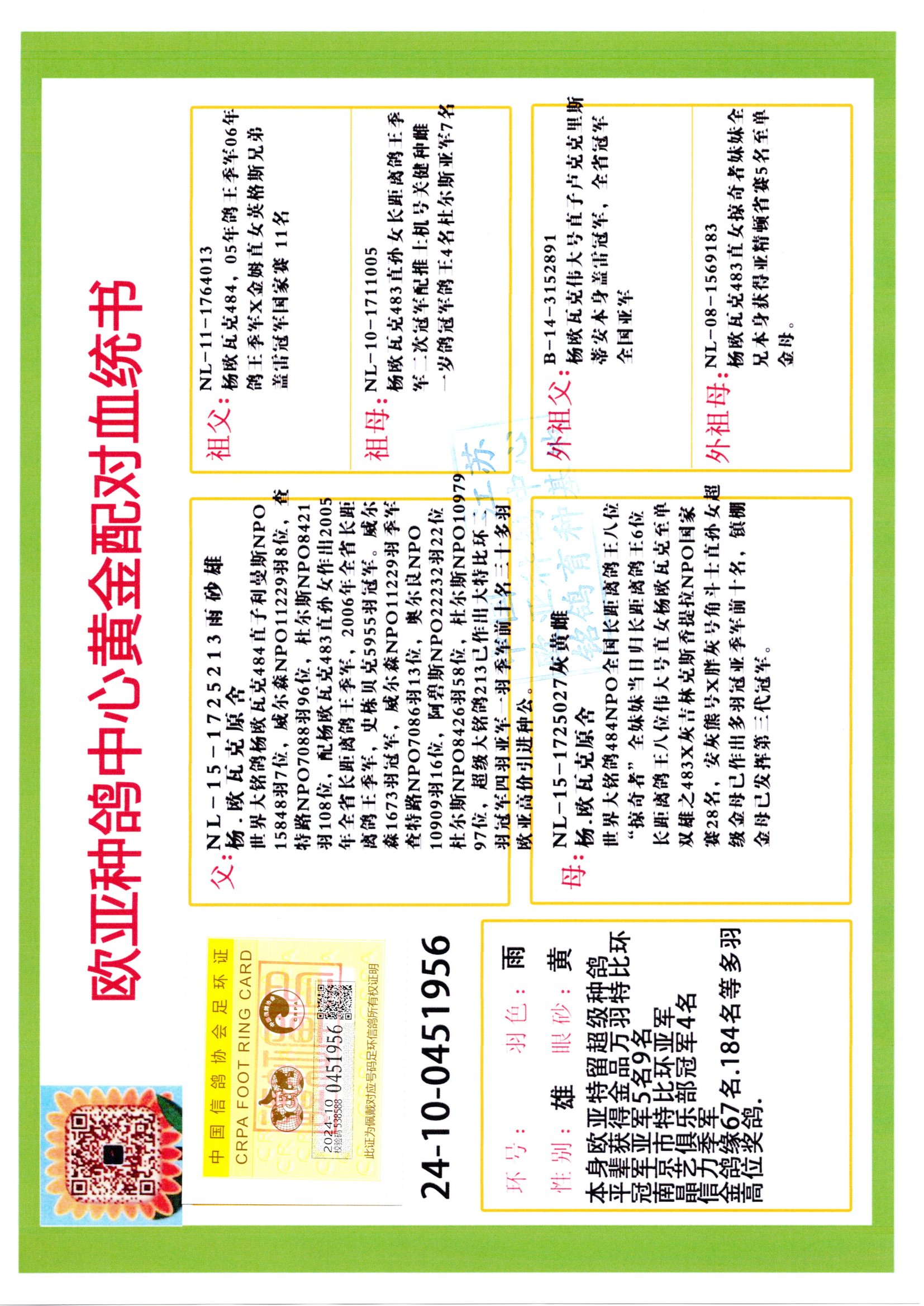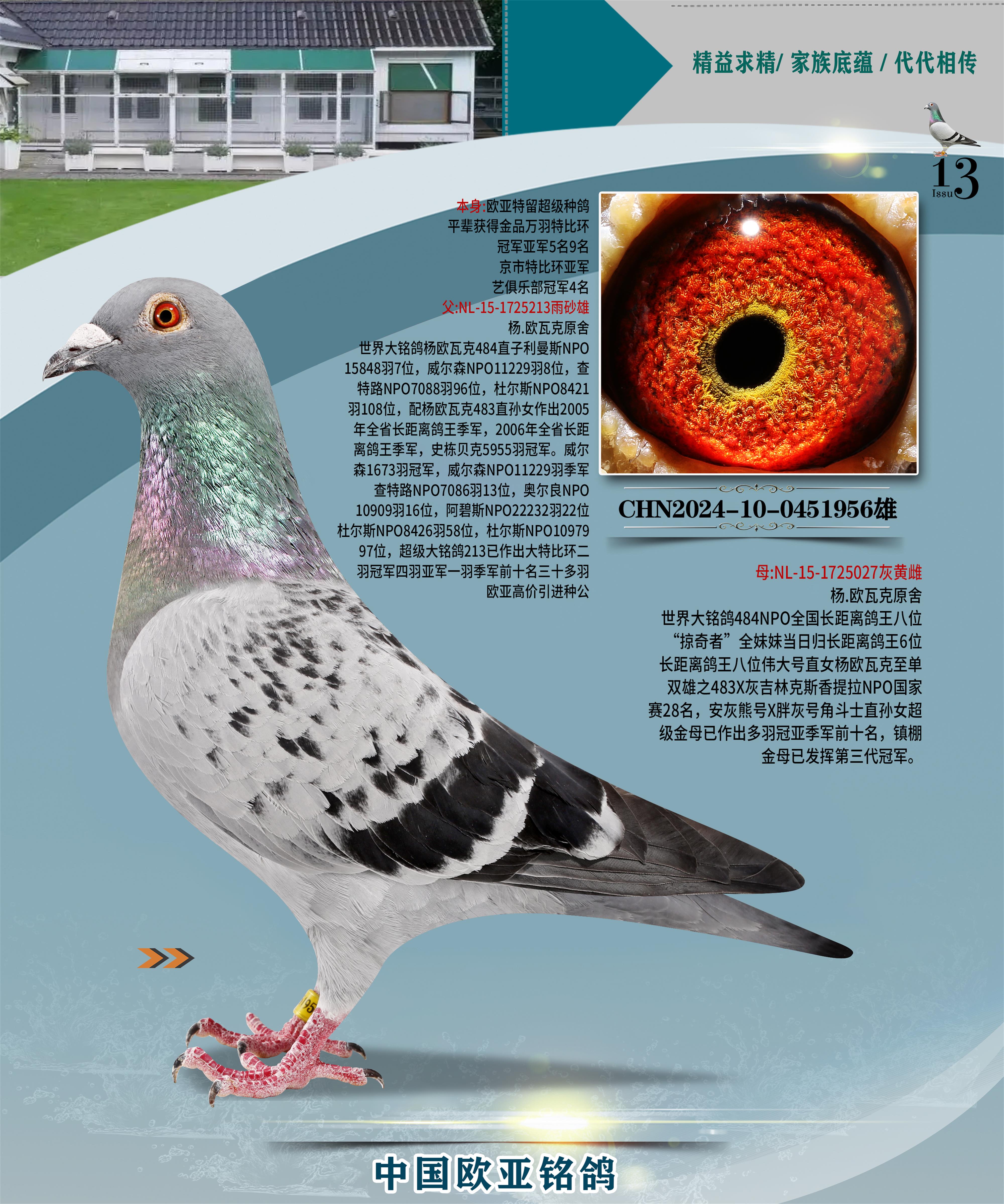 24年秋南京特比环欧亚荣获大团体冠军.小团体冠军551公里大特比13名.14名.16名.19名.20名.21名.24名.26名.27名.28名.42名.52名.54名.57名.65名.66名.68名.70名.71名.72名.74名.76名.80名.82名.83名.84名.85名.86名.90名.92名.110名.116名.121名.122名.128名.131名.158名.161名.164名.165名.166名.172名.174名.177名.182名.195名.196名.201名.205名.208名.210名.216名.253名.269名.275名.276名.294名.296名.299名,,24年秋云南天南铜都公棚决赛415名.天南铜都小棚决赛409名.云南玉活公棚决赛102名.490名.团体32名上笼二羽进二羽,天南铜都大棚506公里决赛445名。热烈祝贺河北省巨鹿县李兰生老师用欧亚泰山号血系连续十一年夺冠军,河北省国家赛冠军.全国季军等多次前十名高位,扬州王军王总用欧亚利奥24年春季获山东翔宇公棚决赛33名盖比53名。南京刘正龙刘总用欧亚盖比获得24年秋山东潍坊国际公棚决赛42名.精英赛30名.三关鸽王71名.决赛86名.加站赛16名.南京市特比环A组鸽王9名.B组鸽王5名.6名.C组鸽王5名.精英赛冠军4名.技能赛A组冠军4名.5名.秦淮区特比环荣获15名.46名.48名.87名。四川西昌徐亮徐总用欧亚利奥获得凉山州聚友决赛177名.第二关亚军双关鸽王19名.三关鸽王105名.云南豪庭公棚决赛603名。热烈祝贺24年四川重庆翔园鸽舍用欧亚泰山号荣获春季400公里冠军.秋季500公里冠军,河北王总用詹森X利奥获得千羽千翔公棚400公里冠军,广东蔡楷焕荣获24年秋爱好者 赛鸽俱乐部三关鸽王季军.一关420公里99名.二关450公里11名.三关520公里32名.单关季军.7名.12名,江西李卫兴荣获贵州红枫公棚8名.共翔俱乐部寄养棚四关综合鸽王30名.一关400公里78名.二关500公里55名.三关520公里37名.四关500公里57名.同父母获公棚18名.雷鸣获得武汉黄浦育翔中心冠军,四川陈文获得四川明鸿俱乐部300公里梦幻2名.3名.4名.9名.10名.13名.14名.15名.31名.34名.40名.41名.42名.43名.69名.71名.72名.73名.74名.94名.95名.97名.98名.99名.419公里决赛荣获总冠军7名.总共归巢9羽,四川徐亮获豪庭决赛603名,山西郑勇获得山西泰鑫公棚决赛255名詹森红狐,热烈祝贺马总获得开尔(飞跃队)决赛9名获奖金1310000万元.第一关52名,天津津福资赛180公里96名.获奖金429543万元,欧亚支持全国鸽友24年秋多人报喜 祝大家取得更好成绩,给欧亚报喜鸽友欧亚决定给每人赠送一羽超级种鸽。欧亚俱乐部特比环多关鸽王成绩:15年秋淮安特比环黑色星期一全会上笼9700多羽,当天无鸽归巢,第二天全会归巢357羽,本舍归巢158羽.前十名八羽.前一百名归巢57羽,16年春季获五关鸽王总冠军,总亚军四名.六名.七名.九名.十名.晶艺俱乐部520公里冠亚季军5名.6名.7名.9名.11名等,火车头冠军.季军6名.8名.9名.10名,16年秋晶艺俱乐部特比环520公里亚军.季军4名.6名.7名.9名,15年春南京白下特比环冠军.亚军.季军6名.7名.8名.9名.10名.指定鸽A B组获得冠军.亚军.季军4名.5名.,17年淮安特比环亚军.4名.5名.7名.8名.10名.六关鸽王总冠军.4名.6名.9名.10名,寄养棚宿迁刘总20羽特比环获冠军.季军.4名.7名.8名.9名等。18年荣获万羽特比环六关鸽王总冠军.总亚军.总季军.6名.8名.十名.单关四羽冠军.二羽亚军.四羽季军.前十名27羽。19年秋万羽特比环六关鸽王总亚军.总季军.5名.8名等,单关二羽冠军.三羽亚军.一羽季军前十名31羽。20年秋淮安市鸽会四关特比环大赛风雨无阻鸽王亚军.鸽王六名,金品俱乐部万羽特比环六关鸽王总冠军,总亚军.四名.五名.六名.七名.八名.十名.前二百名鸽王35羽,单关冠亚季军前十名四十多羽,火车头五关鸽王季军.六名.八名.前二百名鸽王十七羽。20年春荣获淮安五区一市四关鸽王总冠军.亚军.四名.八名.九名。21年秋荣获金品万羽特比环大赛六关鸽王总亚军.总季军.四名.七名.九名.十名.单关冠亚军季军前十名三十多羽。火车头协会鸽王六名.七名.十名.单关前十名十七羽。22年秋荣获鸽王总冠军.总亚军.5名.7名.8名.9名.11名.单关冠亚季军前十名三十多羽,第一关单关前二百名四十多羽,第二关前二百名三十多羽,第三关前二百名四十多羽,第四关前二百名四十多羽,第五关前一百名53羽。23年秋荣获鸽王季军.五名.八名.十名.13名.17名.20名.27名等多羽鸽王.单关前十名二十多羽。公棚.寄养棚部分成绩:16年秋宁夏黄河公棚总冠军电脑戈马力指定通炮冠军,17年送八羽参赛获得鸽王八名进奖四名,支持韩总荣获八名。支持鸽友荣获宁夏中卫公棚决赛总冠军.精英赛冠军,支持18年宁夏黄河公棚决赛冠军詹森X泰山。安徽鼎博寄养棚院内外四关鸽王总冠军.鸽王十七名.三十七名同窝,鸽王39名.42名.58名.67名。18年山东公棚预赛冠军.决赛65名.送八羽进奖五羽.指定获奔驰汽车一辆。支持鸽友获得云南蓝云公棚冠军.盖比X佛卡门。支持鸽友荣获云南银集公棚决赛冠军 詹森427X520血系 速度赛6700羽冠军。17年荣获金马俱乐部寄养棚四关鸽王总冠军.季军.六名.八名.第一关冠军.亚军.季军四名.七名.十一名.金牌教练奖。支持鸽友18年北京费翔公棚预赛九名电脑X桑杰士,支持鸽友荣获陕西威力公棚决赛11名.内蒙古临河寄养棚四关鸽王六名.詹森配泰山,支持河北王总用欧亚詹森427配胡本喜获20年秋开尔青年棚季军。云南东荣公棚16年预赛冠军.决赛77名.17年决赛12名.詹森红狐X泰山,17年平安公棚决赛4名 詹森427。欧亚获得21年金母寄养棚第一关四名.第二关5名.第三关5名.6名.7名.10名.三关鸽王总冠军,四关鸽王14名.十羽鸽王。支持河