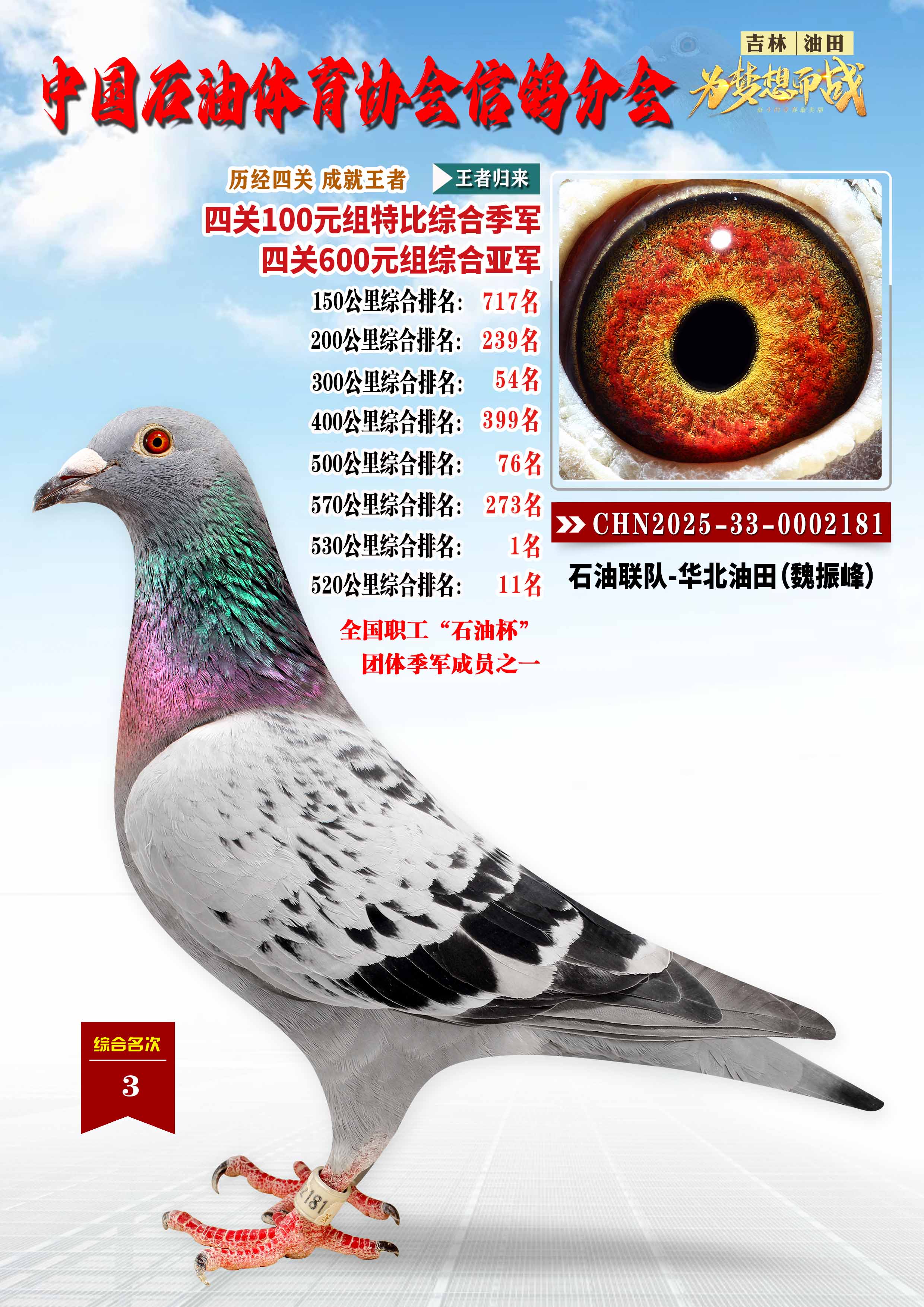 中国石油体育协会信鸽分会2025年“建业杯”全国职工鸽王争霸赛四关500公里综合亚军、吉林油田信鸽协会2025年“丰收杯”特比环四关大奖赛综合季军