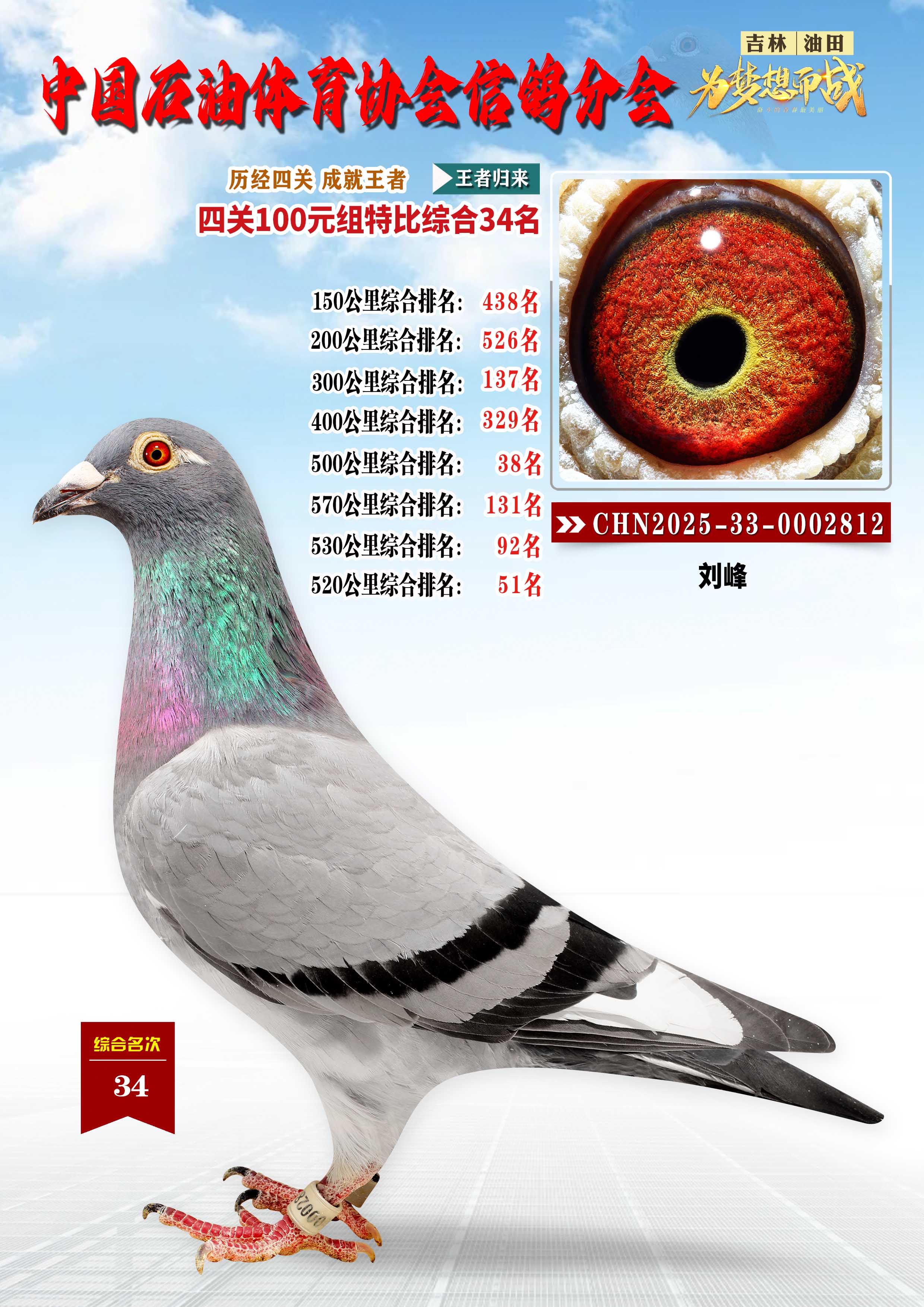 吉林油田信鸽协会2025年“丰收杯”特比环四关大奖赛综合34名