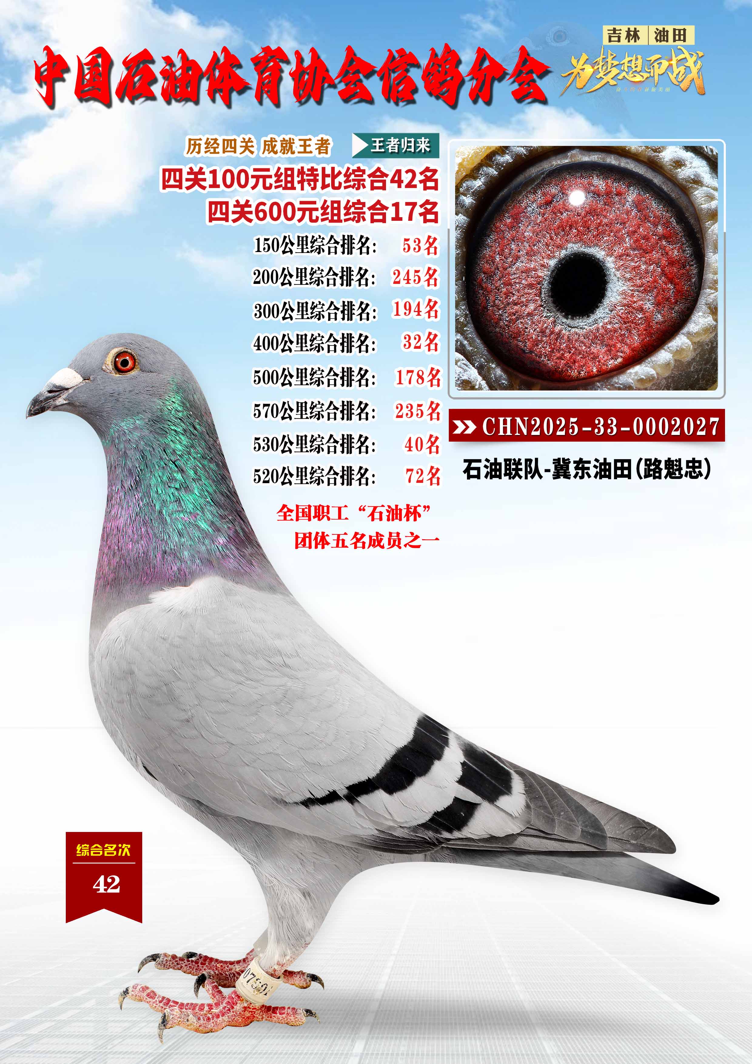 中国石油体育协会信鸽分会2025年“建业杯”全国职工鸽王争霸赛四关500公里综合17名、吉林油田信鸽协会2025年“丰收杯”特比环四关大奖赛综合42名