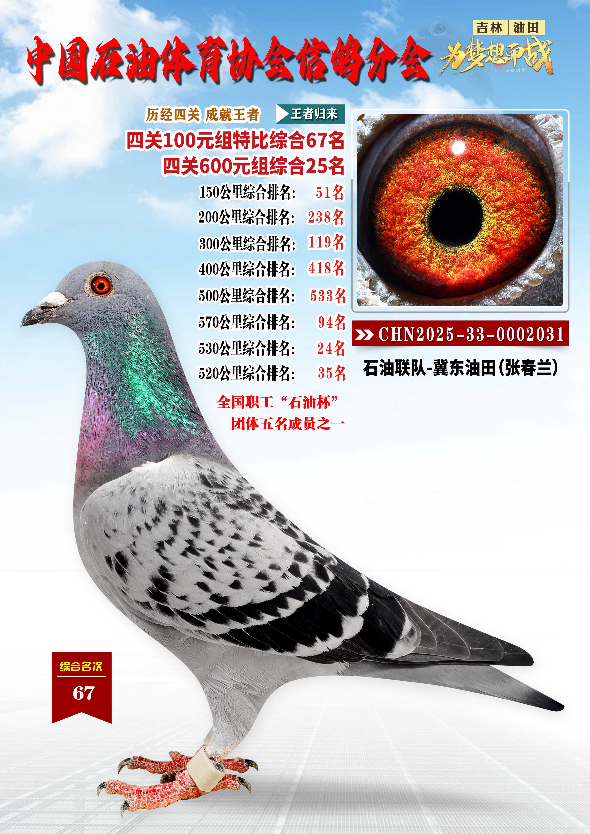 中国石油体育协会信鸽分会2025年“建业杯”全国职工鸽王争霸赛四关500公里综合25名、吉林油田信鸽协会2025年“丰收杯”特比环四关大奖赛综合67名