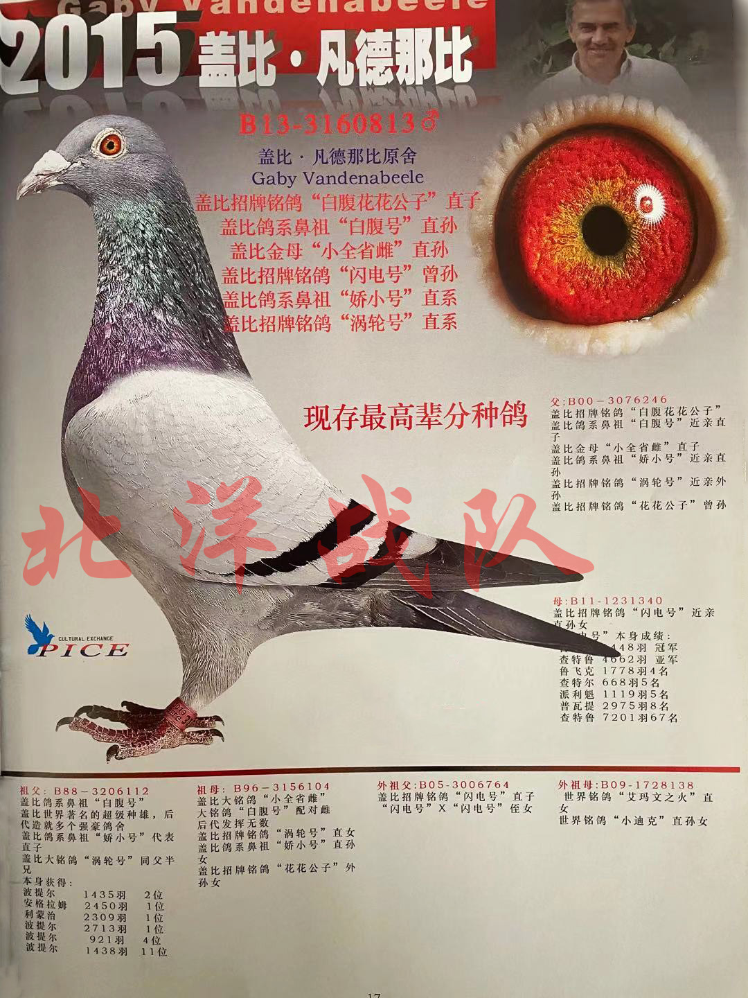 拍得此鸽赠送其同窝雌,以及这两羽的父鸽盖比原棚白腹号直孙B13-3160813,本期二号拍卖鸽!
