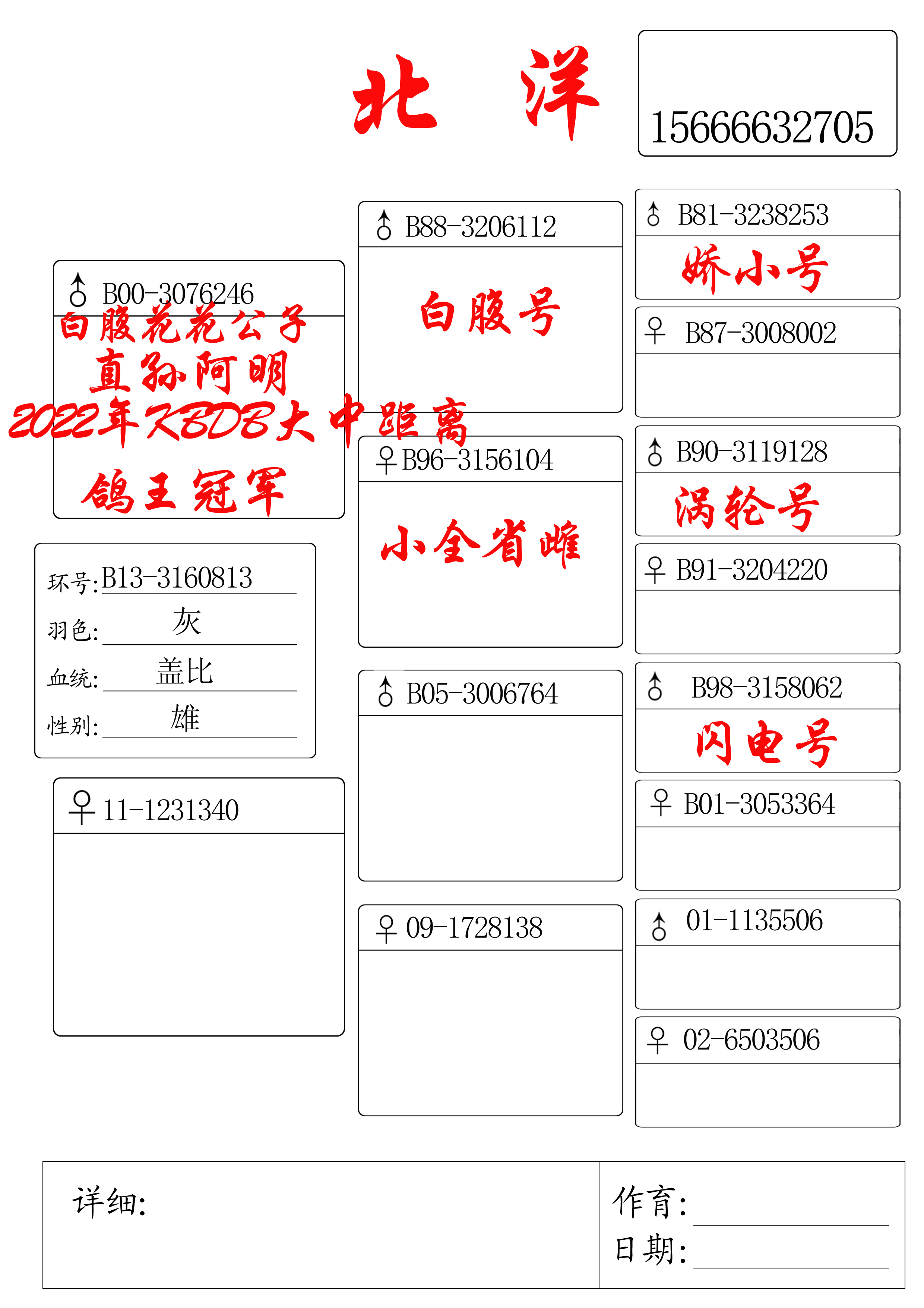 提供血统书、足环证及父母血统书复印件 当年幼鸽雌雄仅供参考,以实际雌雄为准 。