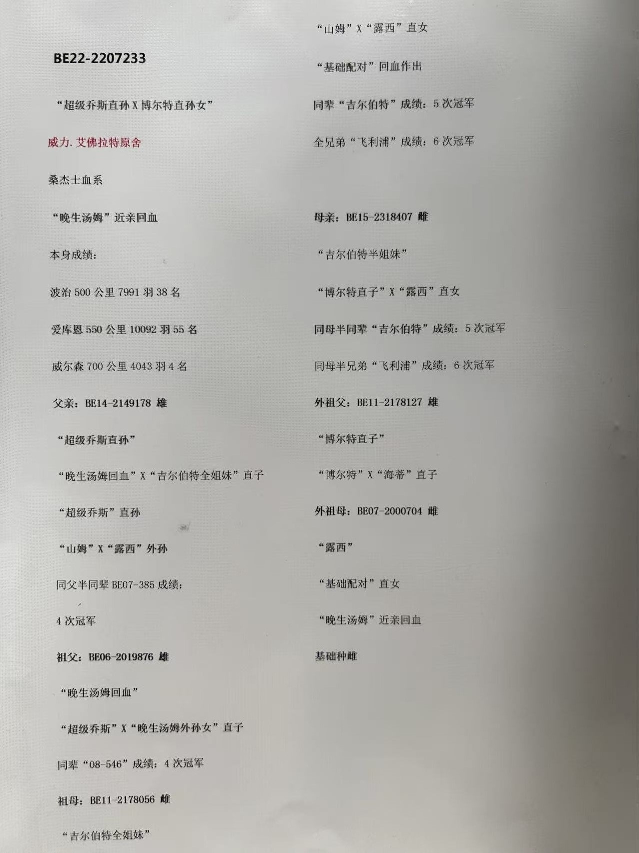 - 当前查看拍卖鸽:威力.艾佛拉特原舍 桑杰士血系