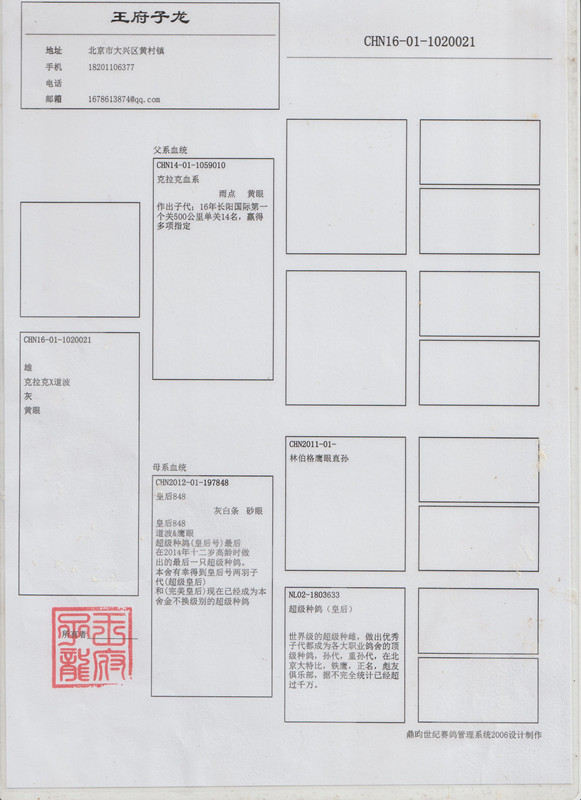 3、注明:请注意看种鸽和血统图片,有的种鸽环卡丢失,有些奖鸽无环卡和奖状和血统,介意请勿出价;