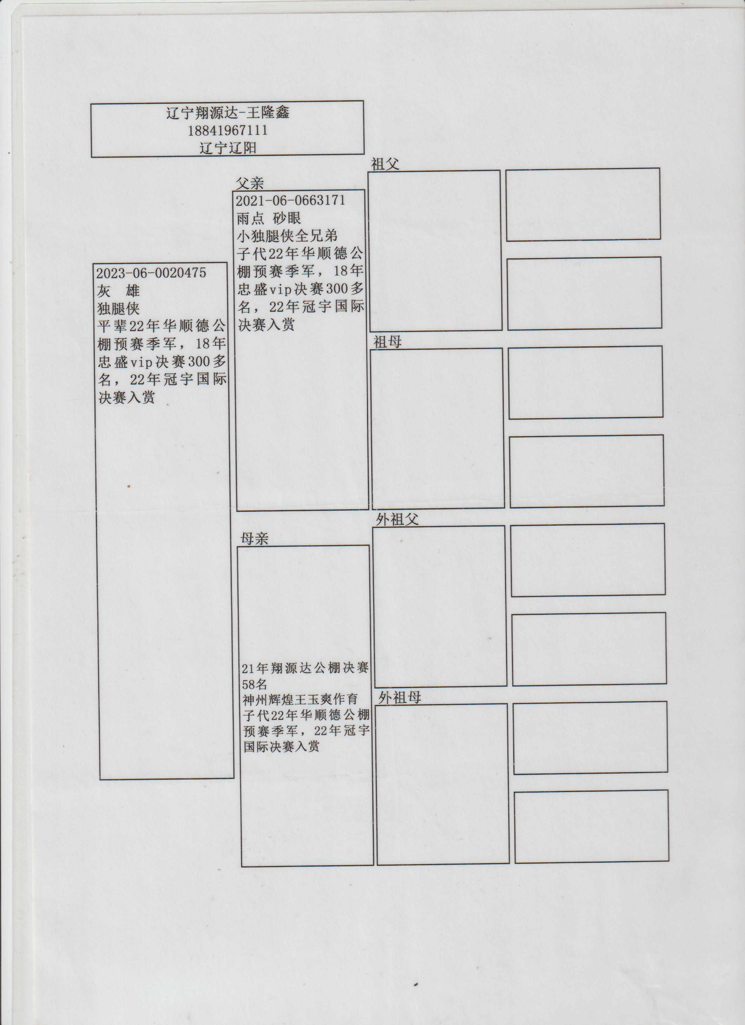 | 1604835 | 翔源达王隆鑫(宇航鸽王冠军平辈) | ¥0元 | 0次 |