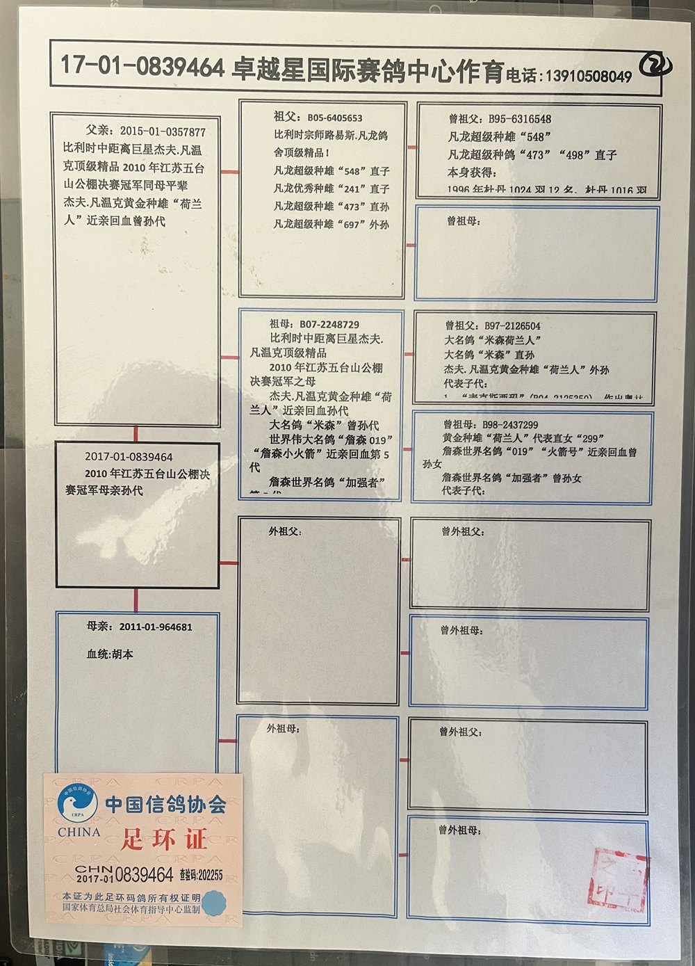 父亲:2015-01-0357877 比利时中距离巨星杰夫.凡温克顶级精品2010年江苏五台山公棚决赛冠军同母平辈杰夫.凡温克黄金种雄“荷兰人”近亲回血曾孙代