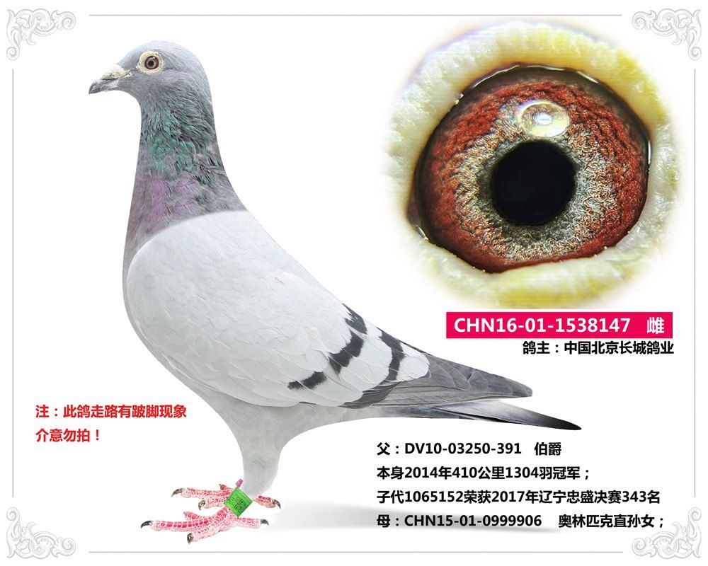 父:DV10-03250-391 伯爵 本身2014年410公里1304羽冠军;子代1065152荣获2017年辽宁忠盛决赛343名