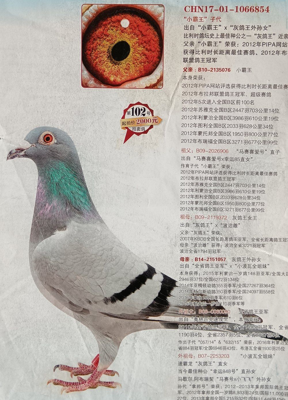 父:B10-2135076 “小霸王” 本身荣获:2012年PIPA网站评选获得比利时长距离最佳赛鸽、2012年布拉邦联盟鸽王冠军、超级赛鸽-在2012年5次进入全国B区前100名、2012年苏雅克全国B区2447羽703公里14 位、2012年利蒙治全国B区3986 羽610公里19位、2012年图利全国B区2033羽628公里34位、 2012年蒙托邦全国B区1950羽800公里77位、2012年布瑞福全国B区3271羽677公里99位