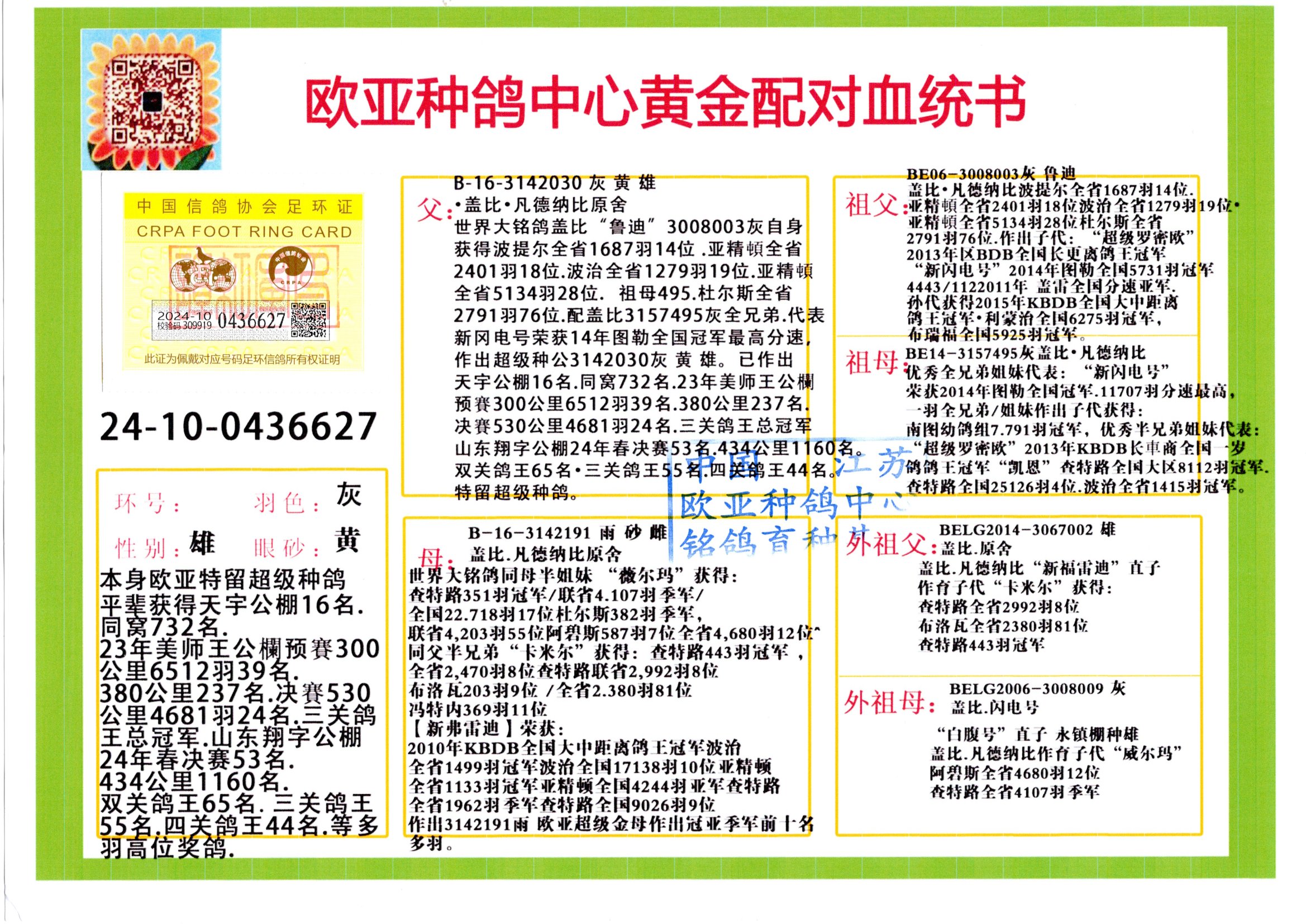 24年秋南京特比环欧亚荣获大团体冠军.小团体冠军551公里大特比13名.14名.16名.19名.20名.21名.24名.26名.27名.28名.42名.52名.54名.57名.65名.66名.68名.70名.71名.72名.74名.76名.80名.82名.83名.84名.85名.86名.90名.92名.110名.116名.121名.122名.128名.131名.158名.161名.164名.165名.166名.172名.174名.177名.182名.195名.196名.201名.205名.208名.210名.216名.253名.269名.275名.276名.294名.296名.299名,,24年秋云南天南铜都公棚决赛415名.天南铜都小棚决赛409名.云南玉活公棚决赛102名.490名.团体32名上笼二羽进二羽,天南铜都大棚506公里决赛445名。热烈祝贺河北省巨鹿县李兰生老师用欧亚泰山号血系连续十一年夺冠军,河北省国家赛冠军.全国季军等多次前十名高位,扬州王军王总用欧亚利奥24年春季获山东翔宇公棚决赛33名盖比53名。南京刘正龙刘总用欧亚盖比获得24年秋山东潍坊国际公棚决赛42名.精英赛30名.三关鸽王71名.决赛86名.加站赛16名.南京市特比环A组鸽王9名.B组鸽王5名.6名.C组鸽王5名.精英赛冠军4名.技能赛A组冠军4名.5名.秦淮区特比环荣获15名.46名.48名.87名。四川西昌徐亮徐总用欧亚利奥获得凉山州聚友决赛177名.第二关亚军双关鸽王19名.三关鸽王105名.云南豪庭公棚决赛603名。热烈祝贺24年四川重庆翔园鸽舍用欧亚泰山号荣获春季400公里冠军.秋季500公里冠军,河北王总用詹森X利奥获得千羽千翔公棚400公里冠军,广东蔡楷焕荣获24年秋爱好者 赛鸽俱乐部三关鸽王季军.一关420公里99名.二关450公里11名.三关520公里32名.单关季军.7名.12名,江西李卫兴荣获贵州红枫公棚8名.共翔俱乐部寄养棚四关综合鸽王30名.一关400公里78名.二关500公里55名.三关520公里37名.四关500公里57名.同父母获公棚18名.雷鸣获得武汉黄浦育翔中心冠军,四川陈文获得四川明鸿俱乐部300公里梦幻2名.3名.4名.9名.10名.13名.14名.15名.31名.34名.40名.41名.42名.43名.69名.71名.72名.73名.74名.94名.95名.97名.98名.99名.419公里决赛荣获总冠军7名.总共归巢9羽,四川徐亮获豪庭决赛603名,山西郑勇获得山西泰鑫公棚决赛255名詹森红狐,热烈祝贺马总获得开尔(飞跃队)决赛9名获奖金1310000万元.第一关52名,天津津福资赛180公里96名.获奖金429543万元,欧亚支持全国鸽友24年秋多人报喜 祝大家取得更好成绩,给欧亚报喜鸽友欧亚决定给每人赠送一羽超级种鸽。欧亚俱乐部特比环多关鸽王成绩:15年秋淮安特比环黑色星期一全会上笼9700多羽,当天无鸽归巢,第二天全会归巢357羽,本舍归巢158羽.前十名八羽.前一百名归巢57羽,16年春季获五关鸽王总冠军,总亚军四名.六名.七名.九名.十名.晶艺俱乐部520公里冠亚季军5名.6名.7名.9名.11名等,火车头冠军.季军6名.8名.9名.10名,16年秋晶艺俱乐部特比环520公里亚军.季军4名.6名.7名.9名,15年春南京白下特比环冠军.亚军.季军6名.7名.8名.9名.10名.指定鸽A B组获得冠军.亚军.季军4名.5名.,17年淮安特比环亚军.4名.5名.7名.8名.10名.六关鸽王总冠军.4名.6名.9名.10名,寄养棚宿迁刘总20羽特比环获冠军.季军.4名.7名.8名.9名等。18年荣获万羽特比环六关鸽王总冠军.总亚军.总季军.6名.8名.十名.单关四羽冠军.二羽亚军.四羽季军.前十名27羽。19年秋万羽特比环六关鸽王总亚军.总季军.5名.8名等,单关二羽冠军.三羽亚军.一羽季军前十名31羽。20年秋淮安市鸽会四关特比环大赛风雨无阻鸽王亚军.鸽王六名,金品俱乐部万羽特比环六关鸽王总冠军,总亚军.四名.五名.六名.七名.八名.十名.前二百名鸽王35羽,单关冠亚季军前十名四十多羽,火车头五关鸽王季军.六名.八名.前二百名鸽王十七羽。20年春荣获淮安五区一市四关鸽王总冠军.亚军.四名.八名.九名。21年秋荣获金品万羽特比环大赛六关鸽王总亚军.总季军.四名.七名.九名.十名.单关冠亚军季军前十名三十多羽。火车头协会鸽王六名.七名.十名.单关前十名十七羽。22年秋荣获鸽王总冠军.总亚军.5名.7名.8名.9名.11名.单关冠亚季军前十名三十多羽,第一关单关前二百名四十多羽,第二关前二百名三十多羽,第三关前二百名四十多羽,第四关前二百名四十多羽,第五关前一百名53羽。23年秋荣获鸽王季军.五名.八名.十名.13名.17名.20名.27名等多羽鸽王.单关前十名二十多羽。公棚.寄养棚部分成绩:16年秋宁夏黄河公棚总冠军电脑戈马力指定通炮冠军,17年送八羽参赛获得鸽王八名进奖四名,支持韩总荣获八名。支持鸽友荣获宁夏中卫公棚决赛总冠军.精英赛冠军,支持18年宁夏黄河公棚决赛冠军詹森X泰山。安徽鼎博寄养棚院内外四关鸽王总冠军.鸽王十七名.三十七名同窝,鸽王39名.42名.58名.67名。18年山东公棚预赛冠军.决赛65名.送八羽进奖五羽.指定获奔驰汽车一辆。支持鸽友获得云南蓝云公棚冠军.盖比X佛卡门。支持鸽友荣获云南银集公棚决赛冠军 詹森427X520血系 速度赛6700羽冠军。17年荣获金马俱乐部寄养棚四关鸽王总冠军.季军.六名.八名.第一关冠军.亚军.季军四名.七名.十一名.金牌教练奖。支持鸽友18年北京费翔公棚预赛九名电脑X桑杰士,支持鸽友荣获陕西威力公棚决赛11名.内蒙古临河寄养棚四关鸽王六名.詹森配泰山,支持河北王总用欧亚詹森427配胡本喜获20年秋开尔青年棚季军。云南东荣公棚16年预赛冠军.决赛77名.17年决赛12名.詹森红狐X泰山,17年平安公棚决赛4名 詹森427。欧亚获得21年金母寄养棚第一关四名.第二关5名.第三关5名.6名.7名.10名.三关鸽王总冠军,四关鸽王14名.十羽鸽王。支持河