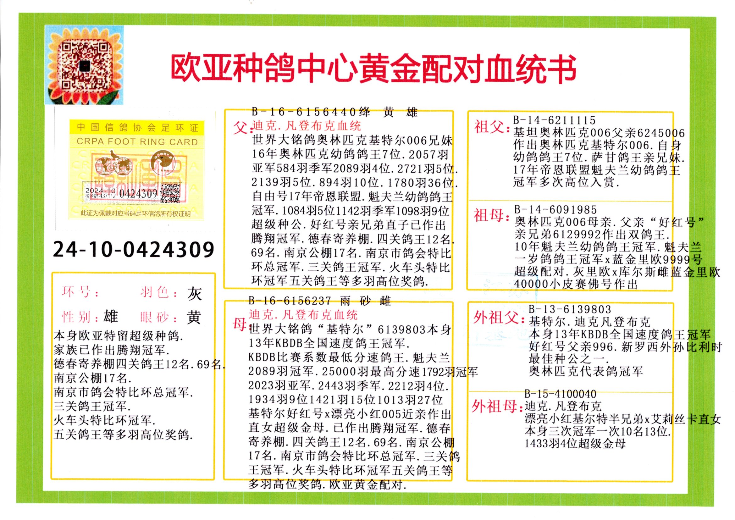 24年秋南京特比环欧亚荣获大团体冠军.小团体冠军551公里大特比13名.14名.16名.19名.20名.21名.24名.26名.27名.28名.42名.52名.54名.57名.65名.66名.68名.70名.71名.72名.74名.76名.80名.82名.83名.84名.85名.86名.90名.92名.110名.116名.121名.122名.128名.131名.158名.161名.164名.165名.166名.172名.174名.177名.182名.195名.196名.201名.205名.208名.210名.216名.253名.269名.275名.276名.294名.296名.299名,,24年秋云南天南铜都公棚决赛415名.天南铜都小棚决赛409名.云南玉活公棚决赛102名.490名.团体32名上笼二羽进二羽,天南铜都大棚506公里决赛445名。热烈祝贺河北省巨鹿县李兰生老师用欧亚泰山号血系连续十一年夺冠军,河北省国家赛冠军.全国季军等多次前十名高位,扬州王军王总用欧亚利奥24年春季获山东翔宇公棚决赛33名盖比53名。南京刘正龙刘总用欧亚盖比获得24年秋山东潍坊国际公棚决赛42名.精英赛30名.三关鸽王71名.决赛86名.加站赛16名.南京市特比环A组鸽王9名.B组鸽王5名.6名.C组鸽王5名.精英赛冠军4名.技能赛A组冠军4名.5名.秦淮区特比环荣获15名.46名.48名.87名。四川西昌徐亮徐总用欧亚利奥获得凉山州聚友决赛177名.第二关亚军双关鸽王19名.三关鸽王105名.云南豪庭公棚决赛603名。热烈祝贺24年四川重庆翔园鸽舍用欧亚泰山号荣获春季400公里冠军.秋季500公里冠军,河北王总用詹森X利奥获得千羽千翔公棚400公里冠军,广东蔡楷焕荣获24年秋爱好者 赛鸽俱乐部三关鸽王季军.一关420公里99名.二关450公里11名.三关520公里32名.单关季军.7名.12名,江西李卫兴荣获贵州红枫公棚8名.共翔俱乐部寄养棚四关综合鸽王30名.一关400公里78名.二关500公里55名.三关520公里37名.四关500公里57名.同父母获公棚18名.雷鸣获得武汉黄浦育翔中心冠军,四川陈文获得四川明鸿俱乐部300公里梦幻2名.3名.4名.9名.10名.13名.14名.15名.31名.34名.40名.41名.42名.43名.69名.71名.72名.73名.74名.94名.95名.97名.98名.99名.419公里决赛荣获总冠军7名.总共归巢9羽,四川徐亮获豪庭决赛603名,山西郑勇获得山西泰鑫公棚决赛255名詹森红狐,热烈祝贺马总获得开尔(飞跃队)决赛9名获奖金1310000万元.第一关52名,天津津福资赛180公里96名.获奖金429543万元,欧亚支持全国鸽友24年秋多人报喜 祝大家取得更好成绩,给欧亚报喜鸽友欧亚决定给每人赠送一羽超级种鸽。欧亚俱乐部特比环多关鸽王成绩:15年秋淮安特比环黑色星期一全会上笼9700多羽,当天无鸽归巢,第二天全会归巢357羽,本舍归巢158羽.前十名八羽.前一百名归巢57羽,16年春季获五关鸽王总冠军,总亚军四名.六名.七名.九名.十名.晶艺俱乐部520公里冠亚季军5名.6名.7名.9名.11名等,火车头冠军.季军6名.8名.9名.10名,16年秋晶艺俱乐部特比环520公里亚军.季军4名.6名.7名.9名,15年春南京白下特比环冠军.亚军.季军6名.7名.8名.9名.10名.指定鸽A B组获得冠军.亚军.季军4名.5名.,17年淮安特比环亚军.4名.5名.7名.8名.10名.六关鸽王总冠军.4名.6名.9名.10名,寄养棚宿迁刘总20羽特比环获冠军.季军.4名.7名.8名.9名等。18年荣获万羽特比环六关鸽王总冠军.总亚军.总季军.6名.8名.十名.单关四羽冠军.二羽亚军.四羽季军.前十名27羽。19年秋万羽特比环六关鸽王总亚军.总季军.5名.8名等,单关二羽冠军.三羽亚军.一羽季军前十名31羽。20年秋淮安市鸽会四关特比环大赛风雨无阻鸽王亚军.鸽王六名,金品俱乐部万羽特比环六关鸽王总冠军,总亚军.四名.五名.六名.七名.八名.十名.前二百名鸽王35羽,单关冠亚季军前十名四十多羽,火车头五关鸽王季军.六名.八名.前二百名鸽王十七羽。20年春荣获淮安五区一市四关鸽王总冠军.亚军.四名.八名.九名。21年秋荣获金品万羽特比环大赛六关鸽王总亚军.总季军.四名.七名.九名.十名.单关冠亚军季军前十名三十多羽。火车头协会鸽王六名.七名.十名.单关前十名十七羽。22年秋荣获鸽王总冠军.总亚军.5名.7名.8名.9名.11名.单关冠亚季军前十名三十多羽,第一关单关前二百名四十多羽,第二关前二百名三十多羽,第三关前二百名四十多羽,第四关前二百名四十多羽,第五关前一百名53羽。23年秋荣获鸽王季军.五名.八名.十名.13名.17名.20名.27名等多羽鸽王.单关前十名二十多羽。公棚.寄养棚部分成绩:16年秋宁夏黄河公棚总冠军电脑戈马力指定通炮冠军,17年送八羽参赛获得鸽王八名进奖四名,支持韩总荣获八名。支持鸽友荣获宁夏中卫公棚决赛总冠军.精英赛冠军,支持18年宁夏黄河公棚决赛冠军詹森X泰山。安徽鼎博寄养棚院内外四关鸽王总冠军.鸽王十七名.三十七名同窝,鸽王39名.42名.58名.67名。18年山东公棚预赛冠军.决赛65名.送八羽进奖五羽.指定获奔驰汽车一辆。支持鸽友获得云南蓝云公棚冠军.盖比X佛卡门。支持鸽友荣获云南银集公棚决赛冠军 詹森427X520血系 速度赛6700羽冠军。17年荣获金马俱乐部寄养棚四关鸽王总冠军.季军.六名.八名.第一关冠军.亚军.季军四名.七名.十一名.金牌教练奖。支持鸽友18年北京费翔公棚预赛九名电脑X桑杰士,支持鸽友荣获陕西威力公棚决赛11名.内蒙古临河寄养棚四关鸽王六名.詹森配泰山,支持河北王总用欧亚詹森427配胡本喜获20年秋开尔青年棚季军。云南东荣公棚16年预赛冠军.决赛77名.17年决赛12名.詹森红狐X泰山,17年平安公棚决赛4名 詹森427。欧亚获得21年金母寄养棚第一关四名.第二关5名.第三关5名.6名.7名.10名.三关鸽王总冠军,四关鸽王14名.十羽鸽王。支持河
