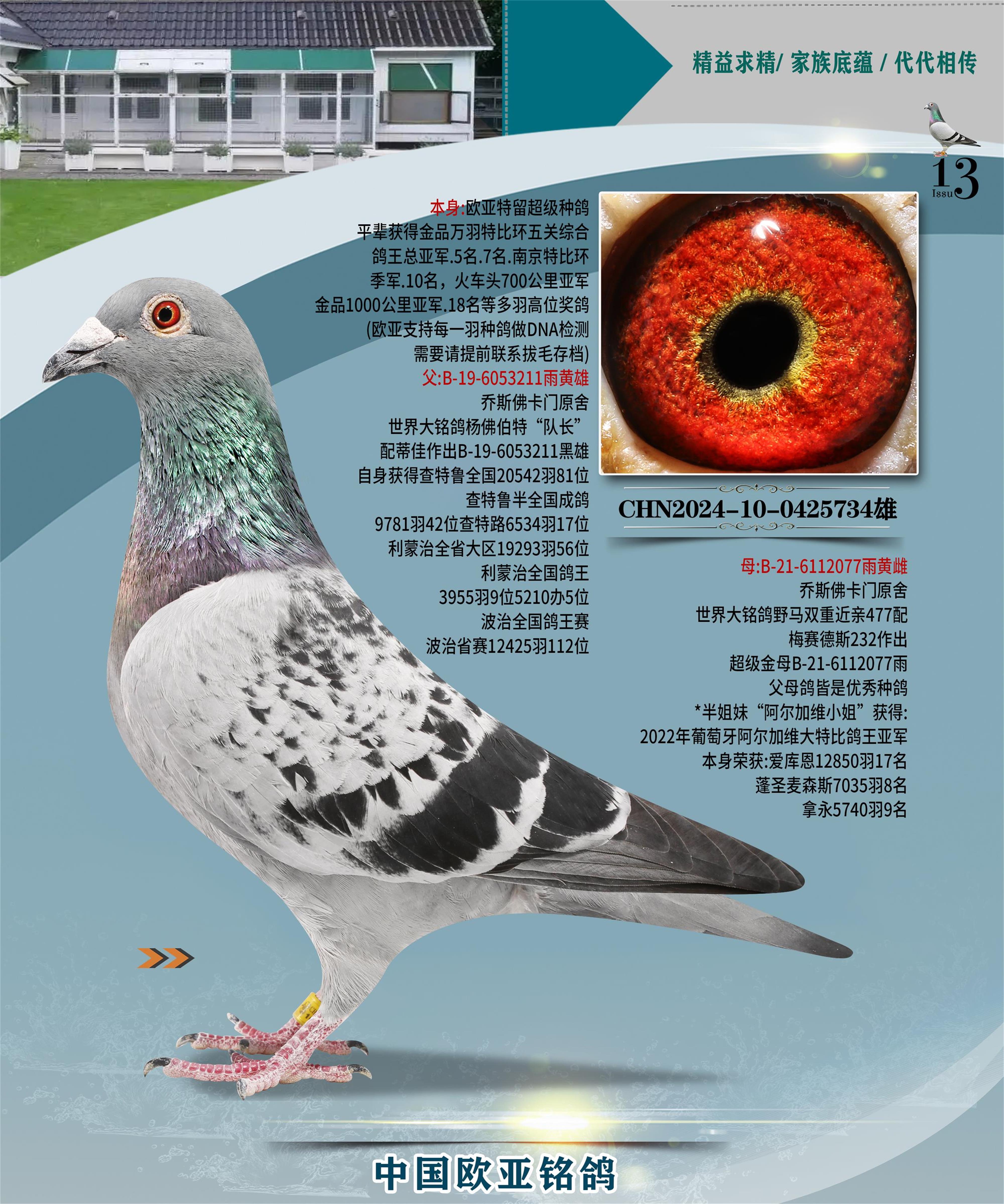 24年秋南京特比环欧亚荣获大团体冠军.小团体冠军551公里大特比13名.14名.16名.19名.20名.21名.24名.26名.27名.28名.42名.52名.54名.57名.65名.66名.68名.70名.71名.72名.74名.76名.80名.82名.83名.84名.85名.86名.90名.92名.110名.116名.121名.122名.128名.131名.158名.161名.164名.165名.166名.172名.174名.177名.182名.195名.196名.201名.205名.208名.210名.216名.253名.269名.275名.276名.294名.296名.299名,,24年秋云南天南铜都公棚决赛415名.天南铜都小棚决赛409名.云南玉活公棚决赛102名.490名.团体32名上笼二羽进二羽,天南铜都大棚506公里决赛445名。热烈祝贺河北省巨鹿县李兰生老师用欧亚泰山号血系连续十一年夺冠军,河北省国家赛冠军.全国季军等多次前十名高位,扬州王军王总用欧亚利奥24年春季获山东翔宇公棚决赛33名盖比53名。南京刘正龙刘总用欧亚盖比获得24年秋山东潍坊国际公棚决赛42名.精英赛30名.三关鸽王71名.决赛86名.加站赛16名.南京市特比环A组鸽王9名.B组鸽王5名.6名.C组鸽王5名.精英赛冠军4名.技能赛A组冠军4名.5名.秦淮区特比环荣获15名.46名.48名.87名。四川西昌徐亮徐总用欧亚利奥获得凉山州聚友决赛177名.第二关亚军双关鸽王19名.三关鸽王105名.云南豪庭公棚决赛603名。热烈祝贺24年四川重庆翔园鸽舍用欧亚泰山号荣获春季400公里冠军.秋季500公里冠军,河北王总用詹森X利奥获得千羽千翔公棚400公里冠军,广东蔡楷焕荣获24年秋爱好者 赛鸽俱乐部三关鸽王季军.一关420公里99名.二关450公里11名.三关520公里32名.单关季军.7名.12名,江西李卫兴荣获贵州红枫公棚8名.共翔俱乐部寄养棚四关综合鸽王30名.一关400公里78名.二关500公里55名.三关520公里37名.四关500公里57名.同父母获公棚18名.雷鸣获得武汉黄浦育翔中心冠军,四川陈文获得四川明鸿俱乐部300公里梦幻2名.3名.4名.9名.10名.13名.14名.15名.31名.34名.40名.41名.42名.43名.69名.71名.72名.73名.74名.94名.95名.97名.98名.99名.419公里决赛荣获总冠军7名.总共归巢9羽,四川徐亮获豪庭决赛603名,山西郑勇获得山西泰鑫公棚决赛255名詹森红狐,热烈祝贺马总获得开尔(飞跃队)决赛9名获奖金1310000万元.第一关52名,天津津福资赛180公里96名.获奖金429543万元,欧亚支持全国鸽友24年秋多人报喜 祝大家取得更好成绩,给欧亚报喜鸽友欧亚决定给每人赠送一羽超级种鸽。欧亚俱乐部特比环多关鸽王成绩:15年秋淮安特比环黑色星期一全会上笼9700多羽,当天无鸽归巢,第二天全会归巢357羽,本舍归巢158羽.前十名八羽.前一百名归巢57羽,16年春季获五关鸽王总冠军,总亚军四名.六名.七名.九名.十名.晶艺俱乐部520公里冠亚季军5名.6名.7名.9名.11名等,火车头冠军.季军6名.8名.9名.10名,16年秋晶艺俱乐部特比环520公里亚军.季军4名.6名.7名.9名,15年春南京白下特比环冠军.亚军.季军6名.7名.8名.9名.10名.指定鸽A B组获得冠军.亚军.季军4名.5名.,17年淮安特比环亚军.4名.5名.7名.8名.10名.六关鸽王总冠军.4名.6名.9名.10名,寄养棚宿迁刘总20羽特比环获冠军.季军.4名.7名.8名.9名等。18年荣获万羽特比环六关鸽王总冠军.总亚军.总季军.6名.8名.十名.单关四羽冠军.二羽亚军.四羽季军.前十名27羽。19年秋万羽特比环六关鸽王总亚军.总季军.5名.8名等,单关二羽冠军.三羽亚军.一羽季军前十名31羽。20年秋淮安市鸽会四关特比环大赛风雨无阻鸽王亚军.鸽王六名,金品俱乐部万羽特比环六关鸽王总冠军,总亚军.四名.五名.六名.七名.八名.十名.前二百名鸽王35羽,单关冠亚季军前十名四十多羽,火车头五关鸽王季军.六名.八名.前二百名鸽王十七羽。20年春荣获淮安五区一市四关鸽王总冠军.亚军.四名.八名.九名。21年秋荣获金品万羽特比环大赛六关鸽王总亚军.总季军.四名.七名.九名.十名.单关冠亚军季军前十名三十多羽。火车头协会鸽王六名.七名.十名.单关前十名十七羽。22年秋荣获鸽王总冠军.总亚军.5名.7名.8名.9名.11名.单关冠亚季军前十名三十多羽,第一关单关前二百名四十多羽,第二关前二百名三十多羽,第三关前二百名四十多羽,第四关前二百名四十多羽,第五关前一百名53羽。23年秋荣获鸽王季军.五名.八名.十名.13名.17名.20名.27名等多羽鸽王.单关前十名二十多羽。公棚.寄养棚部分成绩:16年秋宁夏黄河公棚总冠军电脑戈马力指定通炮冠军,17年送八羽参赛获得鸽王八名进奖四名,支持韩总荣获八名。支持鸽友荣获宁夏中卫公棚决赛总冠军.精英赛冠军,支持18年宁夏黄河公棚决赛冠军詹森X泰山。安徽鼎博寄养棚院内外四关鸽王总冠军.鸽王十七名.三十七名同窝,鸽王39名.42名.58名.67名。18年山东公棚预赛冠军.决赛65名.送八羽进奖五羽.指定获奔驰汽车一辆。支持鸽友获得云南蓝云公棚冠军.盖比X佛卡门。支持鸽友荣获云南银集公棚决赛冠军 詹森427X520血系 速度赛6700羽冠军。17年荣获金马俱乐部寄养棚四关鸽王总冠军.季军.六名.八名.第一关冠军.亚军.季军四名.七名.十一名.金牌教练奖。支持鸽友18年北京费翔公棚预赛九名电脑X桑杰士,支持鸽友荣获陕西威力公棚决赛11名.内蒙古临河寄养棚四关鸽王六名.詹森配泰山,支持河北王总用欧亚詹森427配胡本喜获20年秋开尔青年棚季军。云南东荣公棚16年预赛冠军.决赛77名.17年决赛12名.詹森红狐X泰山,17年平安公棚决赛4名 詹森427。欧亚获得21年金母寄养棚第一关四名.第二关5名.第三关5名.6名.7名.10名.三关鸽王总冠军,四关鸽王14名.十羽鸽王。支持河