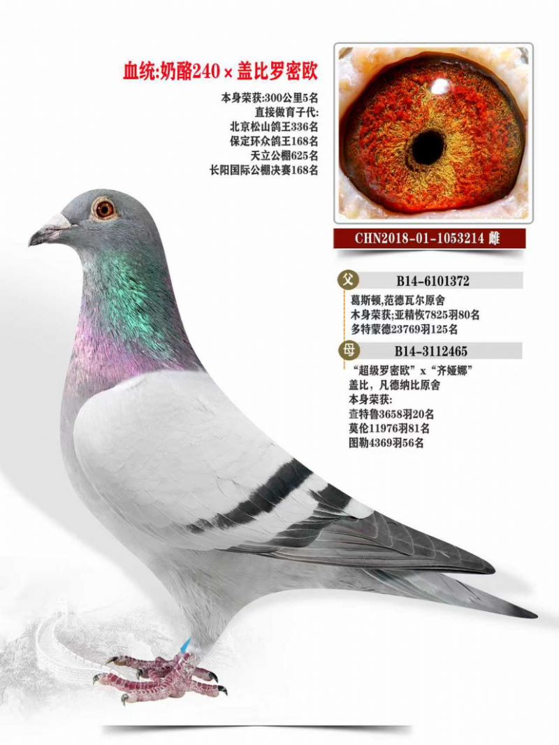 金母2142018-01-1053214雌血统:奶酪240×盖比罗密欧本身荣获:300公里5名直接做育子代:北京松山鸽王336名保定环众鸽王168名天立公棚625名长阳国际公棚决赛168名父亲:B14-6101372葛斯顿,范德瓦尔原舍木身荣获;亚精恢7825羽80名多特蒙德23769羽125名母亲B14-3112465“超级罗密欧”x“齐娅娜”盖比,凡德纳比原舍本身荣获:査特鲁3658羽20名莫伦11976羽81名图勒4369羽56名