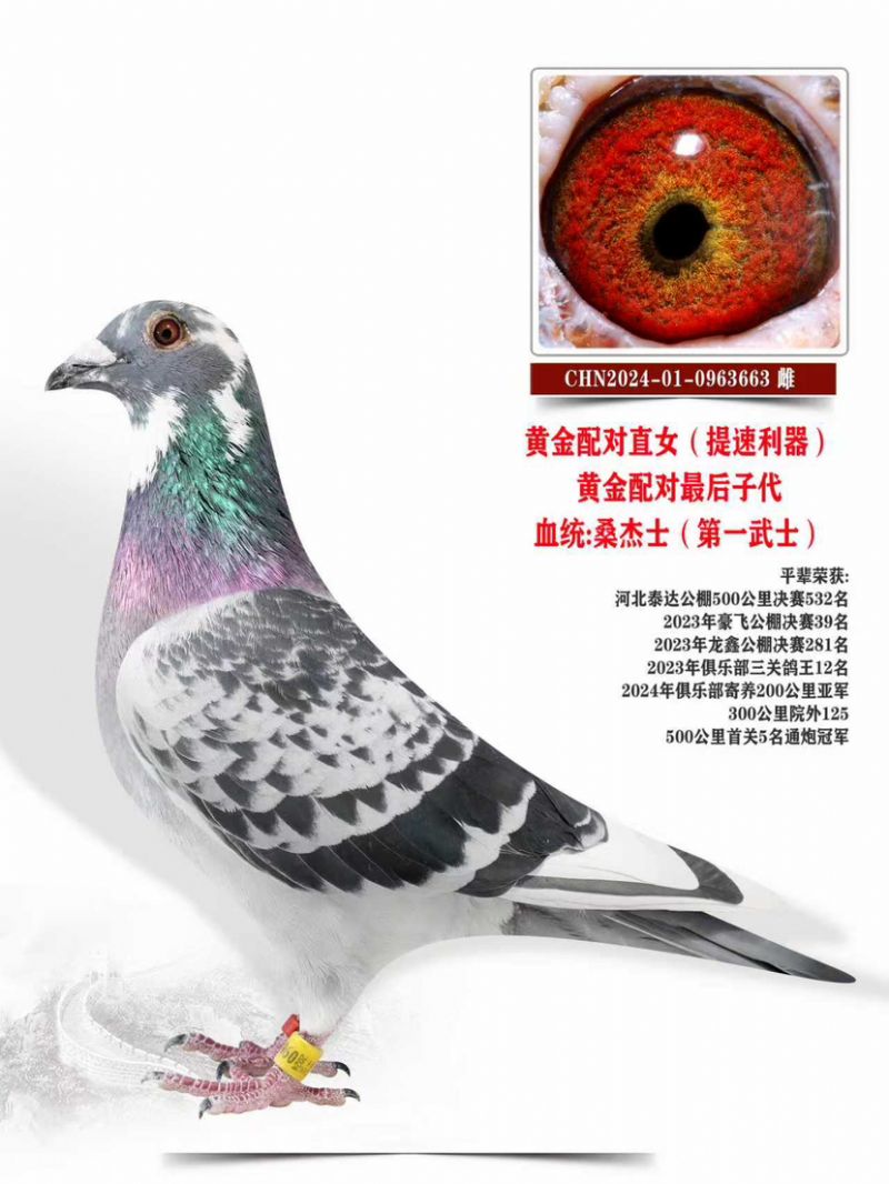 黄金配对直女(提速利器)黄金配对最后子代2024-01-0963663血统:桑杰士(第一武士)平辈荣获:河北泰达公棚500公里决赛532名2023年豪飞公棚决赛39名2023年龙鑫公棚决赛281名2023年俱乐部三关鸽王12名2024年俱乐部寄养200公里亚军300公里院外125500公里首关5名通炮冠军