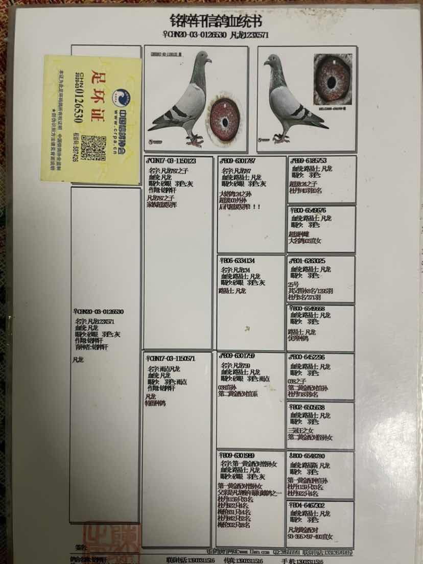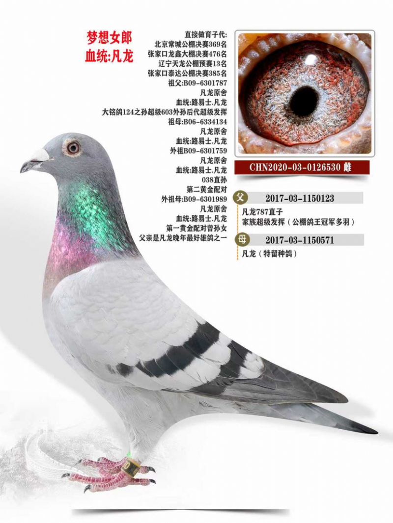 梦想女郎2020-03-0126530雌血统凡龙直接做育子代:北京常城公棚决赛369名张家口龙鑫大棚决赛476名辽宁天龙公棚预赛13名张家口泰达公棚决赛385名父亲:2017-03-1150123凡龙787直子家族超级发挥(公棚鸽王冠军多羽)祖父:B09-6301787凡龙原舍血统:路易士.凡龙大铭鸽124之孙超级603外孙后代超级发挥祖母:B06-6334134凡龙原舍血统:路易士.凡龙母亲:2017-03-1150571凡龙(特留种鸽)外祖B09-6301759凡龙原舍血统:路易士.凡龙038直孙第二黄金配对外祖母:B09-6301989凡龙原舍血统:路易士.凡龙第一黄金配对曾孙女父亲是凡龙晚年最好雄鸽之一