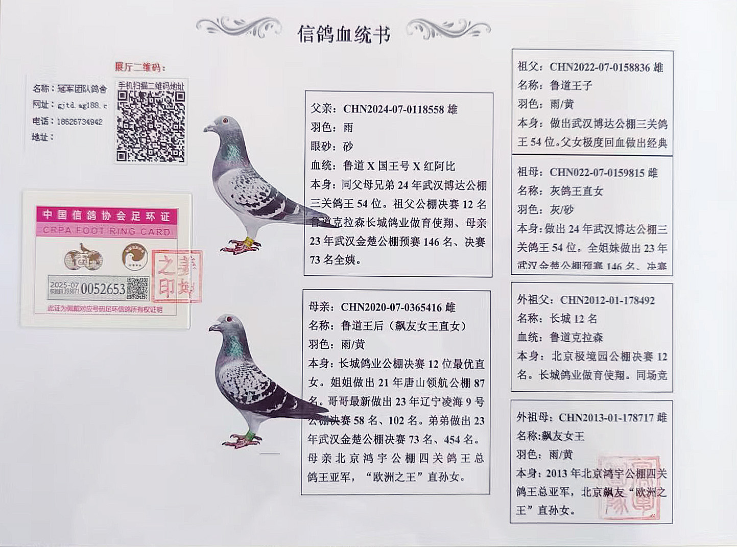 空间有限0元分享,假一赔百,拒卖百家鸽。机不可失。成绩、血统永久保真。血统书足环卡随鸽发出。