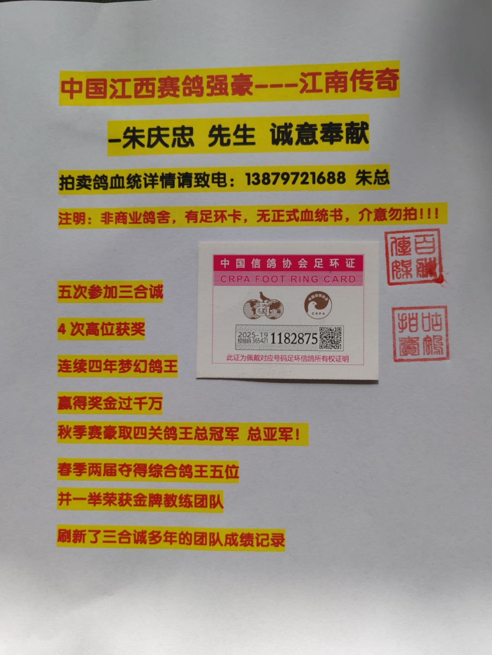 江西赛鸽强豪:江南传奇-朱庆忠 先生 13879721688
