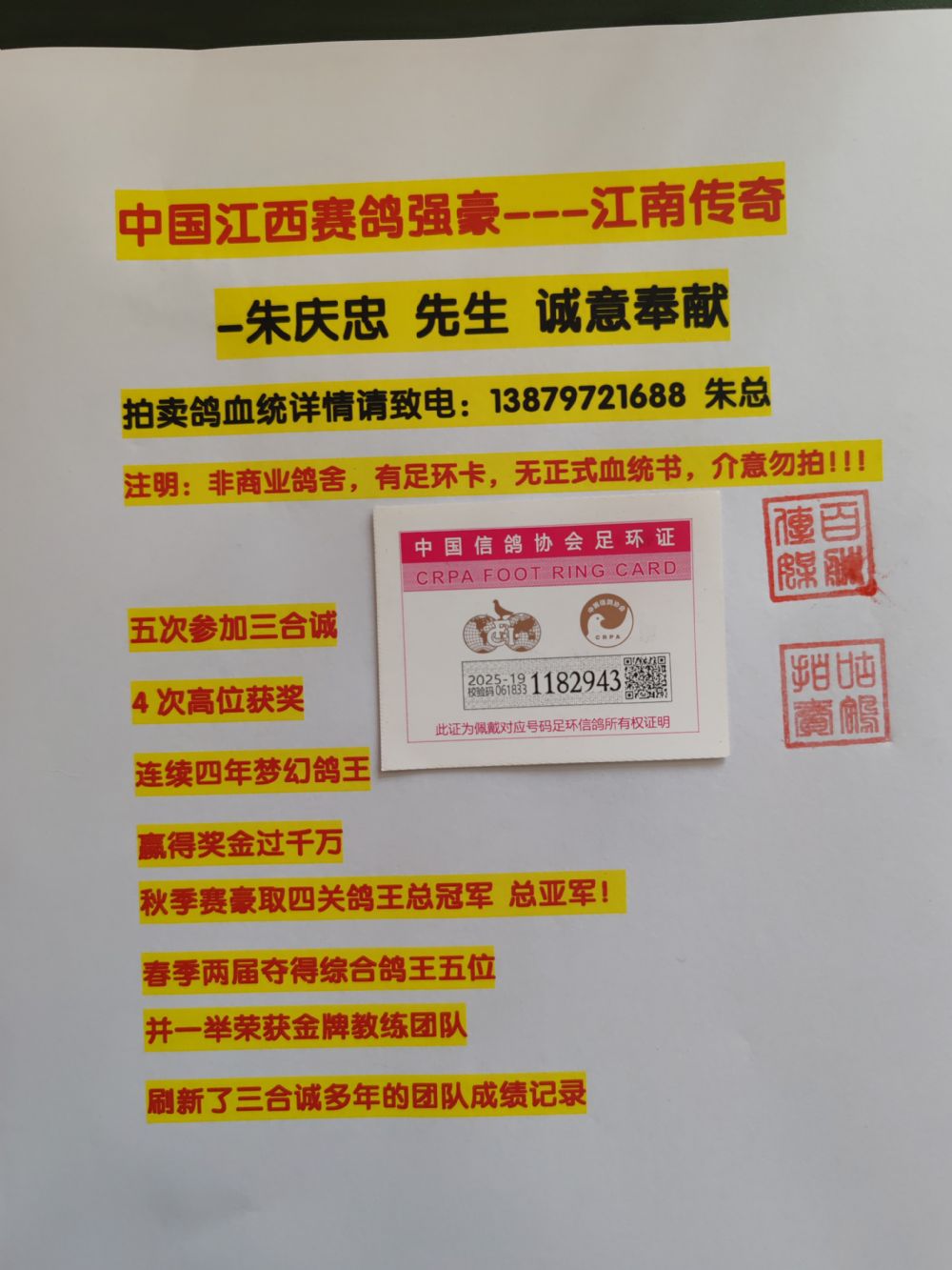 江西赛鸽强豪:江南传奇-朱庆忠 先生 13879721688