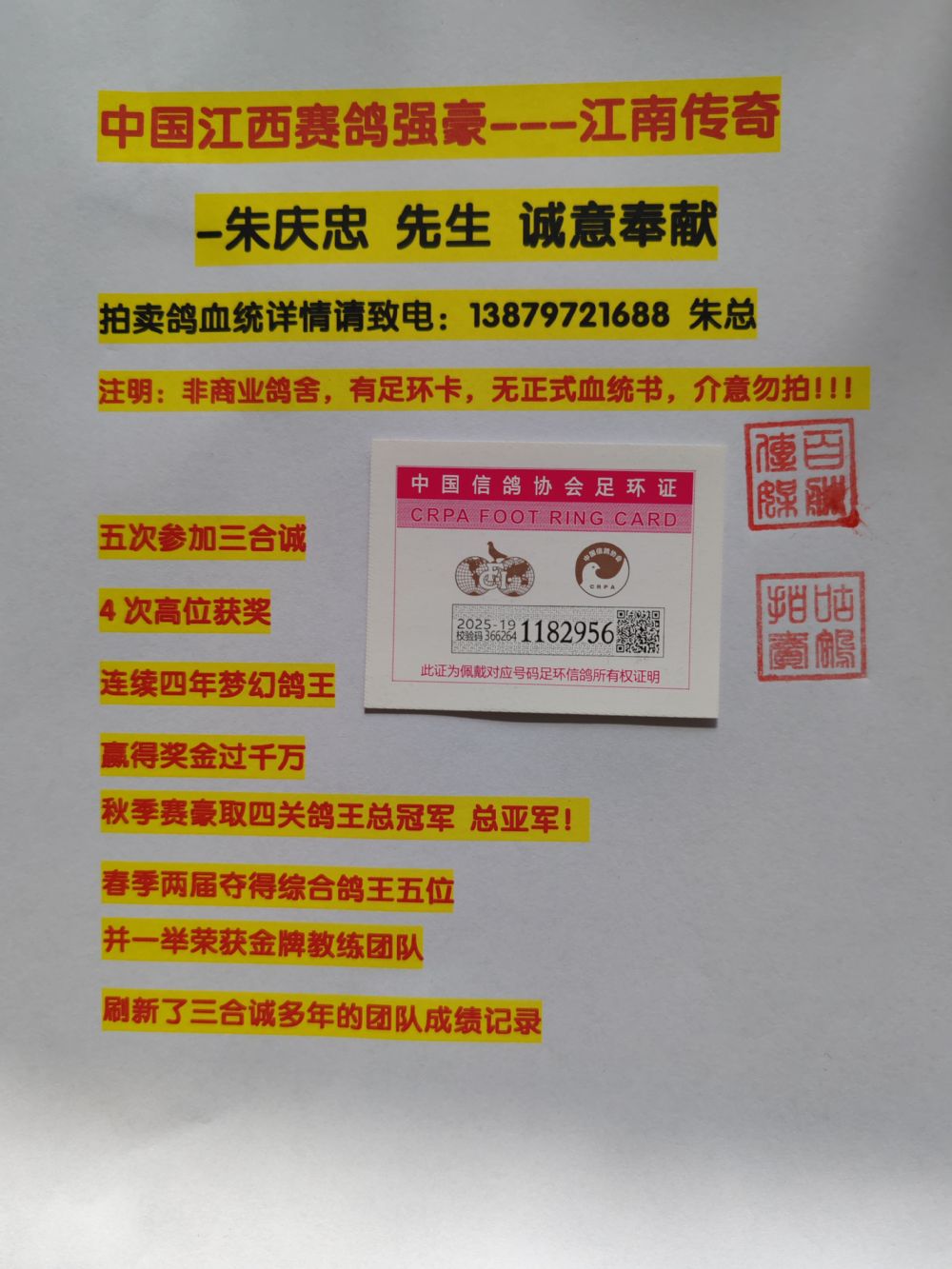 江西赛鸽强豪:江南传奇-朱庆忠 先生 13879721688