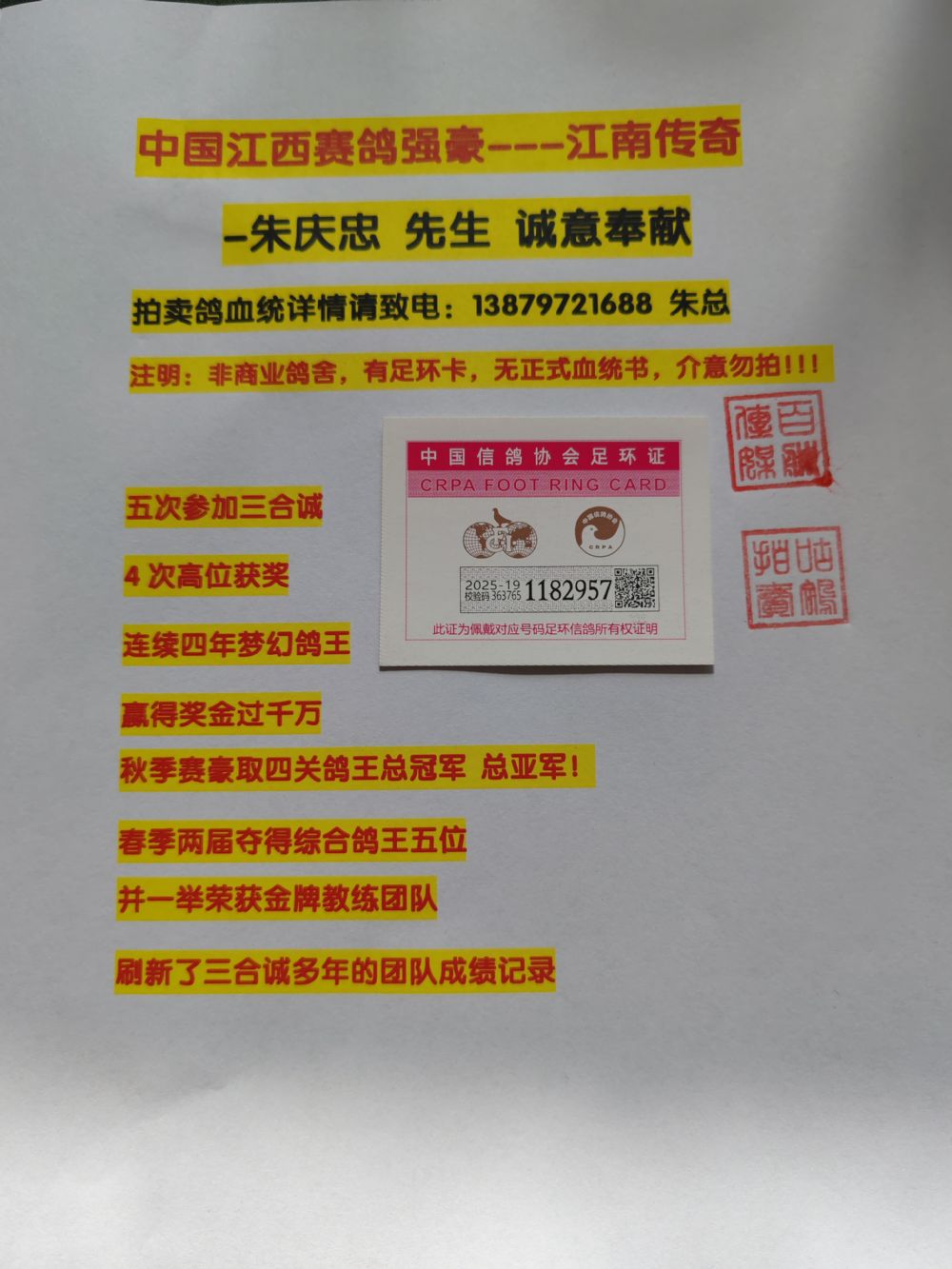 江西赛鸽强豪:江南传奇-朱庆忠 先生 13879721688