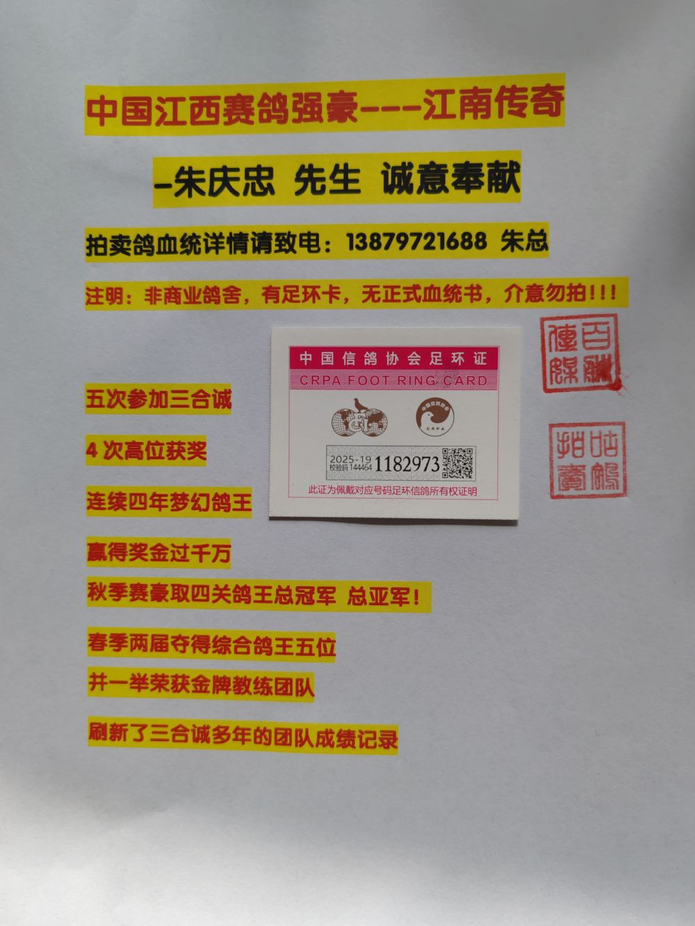江西赛鸽强豪:江南传奇-朱庆忠 先生 13879721688