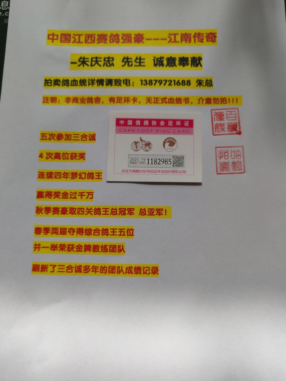 江西赛鸽强豪:江南传奇-朱庆忠 先生 13879721688