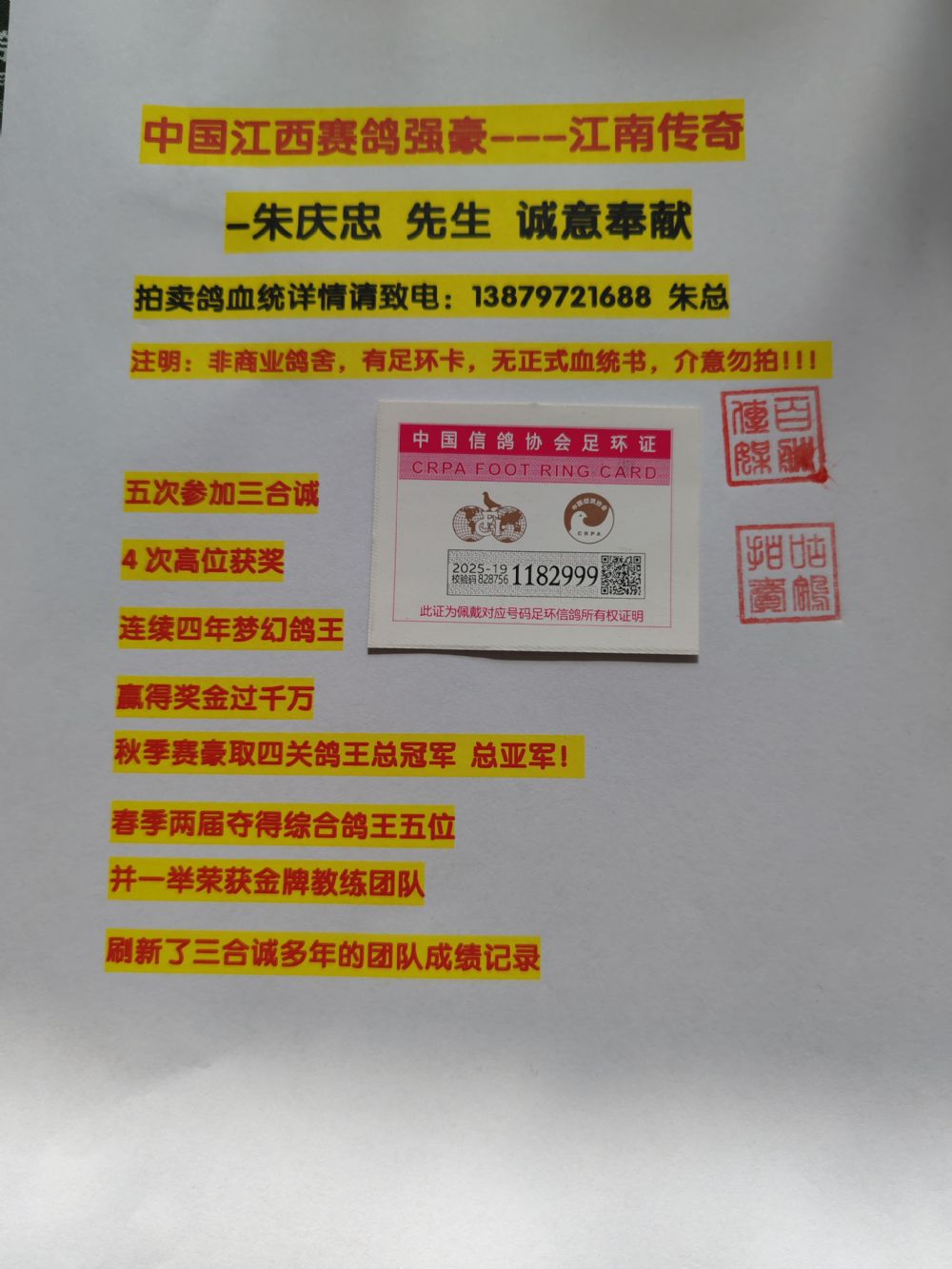 江西赛鸽强豪:江南传奇-朱庆忠 先生 13879721688