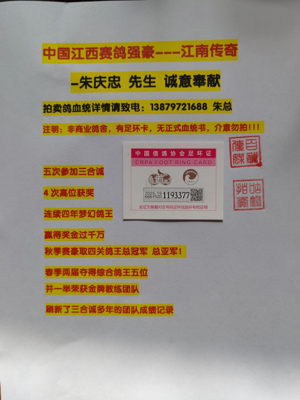 江西赛鸽强豪:江南传奇-朱庆忠 先生 13879721688