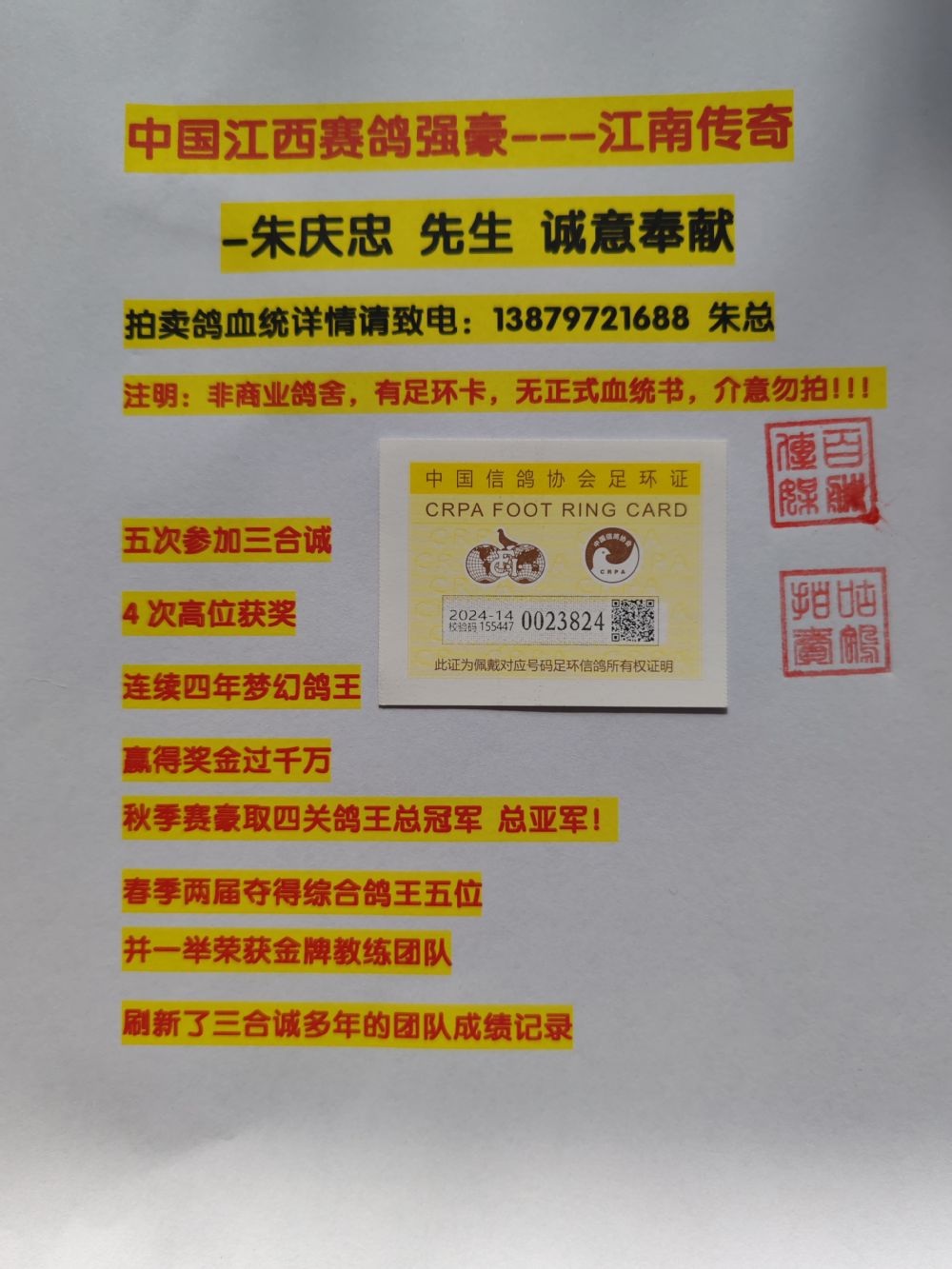 江西赛鸽强豪:江南传奇-朱庆忠 先生 13879721688