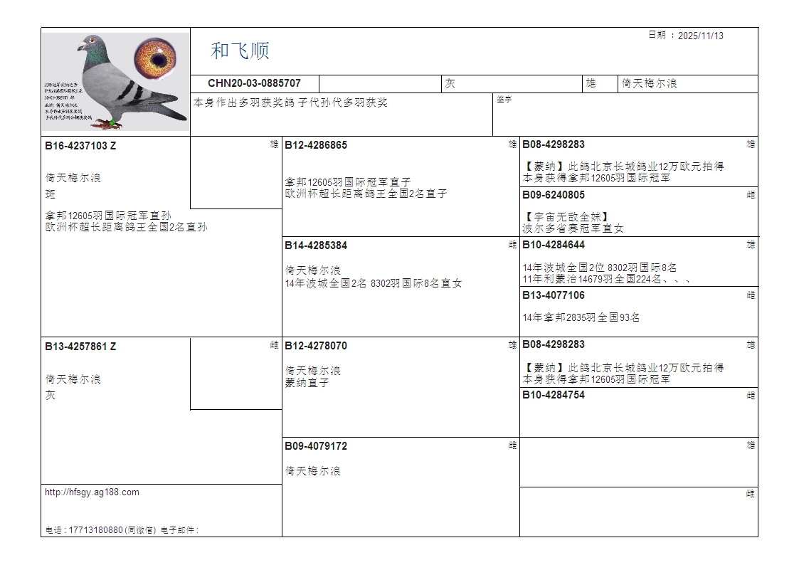 - 当前查看拍卖鸽:倚天梅尔浪 作出多羽获奖鸽