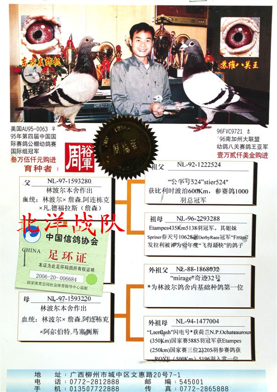 2001年广东湛江公棚500公里决赛4名、9名(与冠军同时到达) 2002年广东湛江公棚500公里决赛6名、18名、20名(与冠军同时到达)