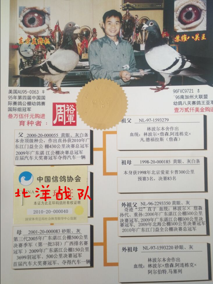 2014年广东湛江公棚200公里49名、182名,300公里预赛6名、49名,500公里决赛季军(三关鸽王冠军),36名(三关综合6名),520公里附加赛39名(四关鸽王季军)