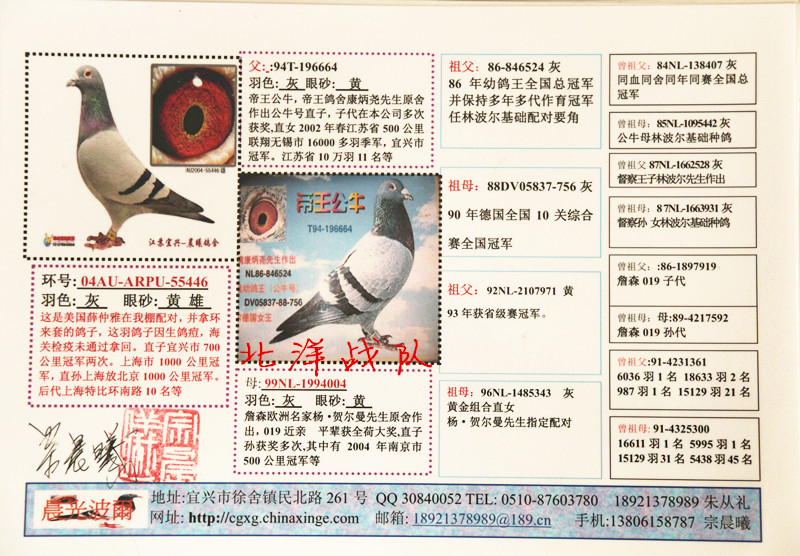 帝王公牛,帝王鸽舍康炳尧先生原舍作出公牛号直子,子代在本公司多次获奖,直女2002年春江苏省500公里联翔无锡市16000多羽季军,宜兴市冠军。江苏省10万羽11名等