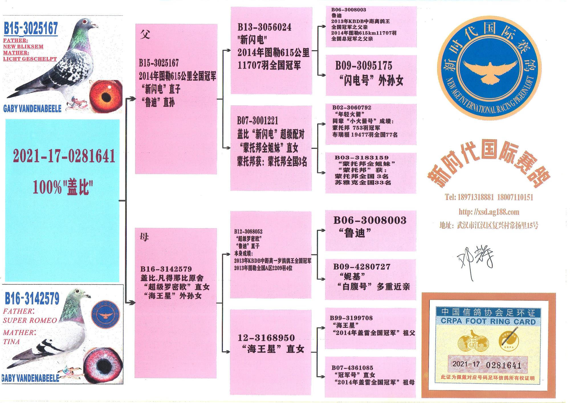兄弟“新闪电”B13-3056024,入赏2014年图勒全国一岁组5735羽冠军,11707羽总冠军