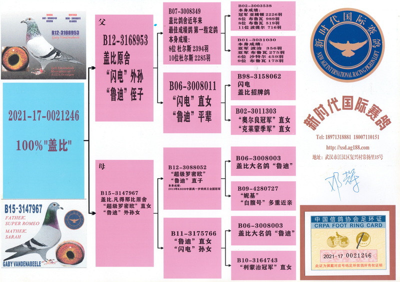 比利时赛鸽教父盖比,一岁鸽B13-3056024,勇夺一岁鸽冠军,11707羽总冠军!此鸽于当天下午14点37分57秒归巢,空距为614.934公里,分速为1342.8米/分。