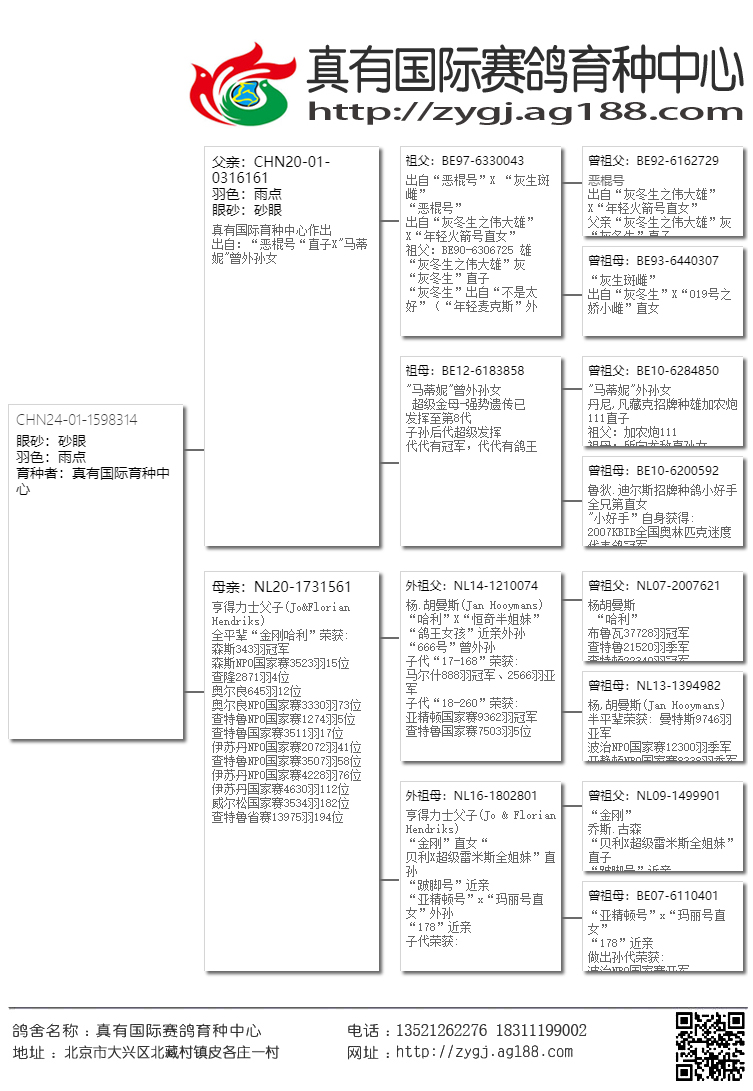 【在这三座金矿还未被世人发现之前,真有国际就第一时间把高品质的鸽子带到了国内,取得了空前的发挥。近几年大家才逐渐认识这几位大师鸽子的魅力。请记住!当任何商业鸽舍进入炒作后期的时候,他的鸽子质量与价值都会急剧下降,即便是詹森兄弟也难免于此。所以引进这家鸽舍最巅峰时期的鸽子,得以延续,才是真有国际成功的致胜法宝。】