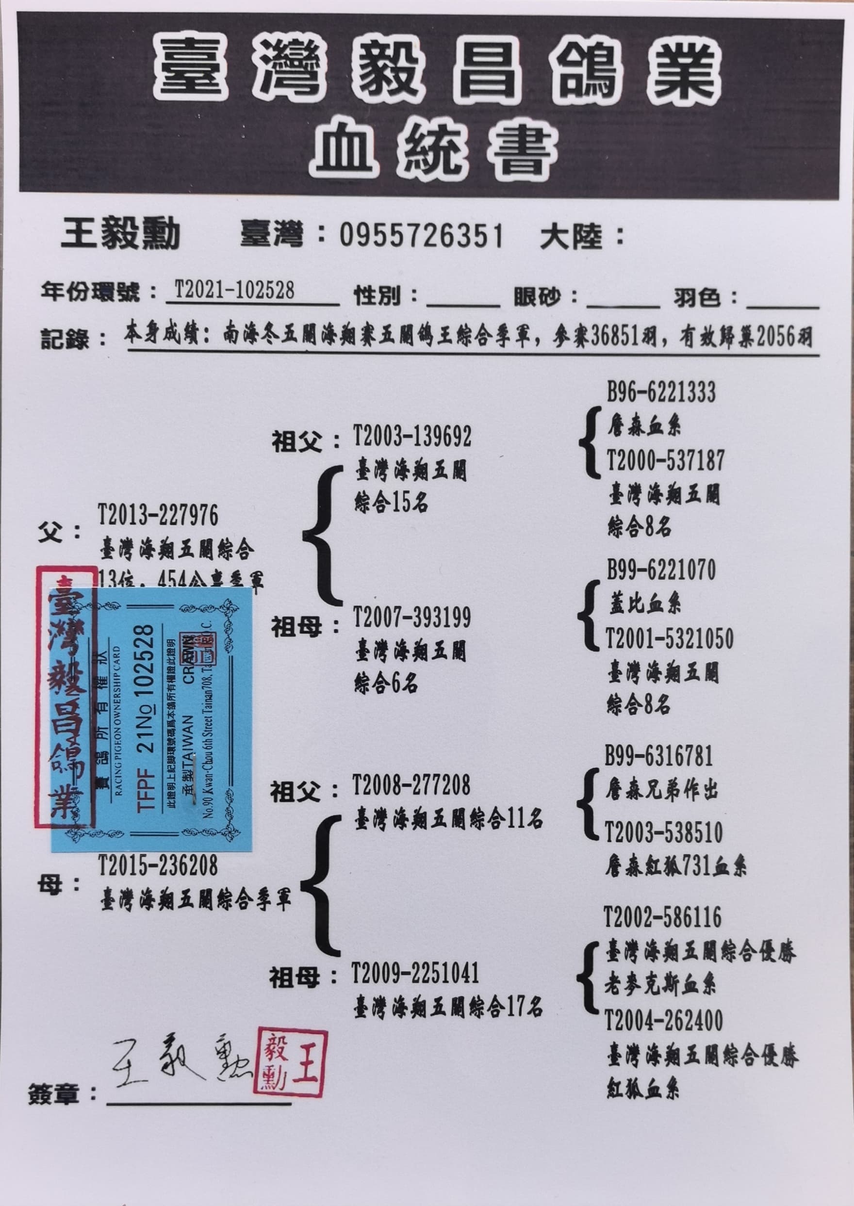- 当前查看拍卖鸽:台湾毅昌鸽业作育詹森血系本身荣获五关综合