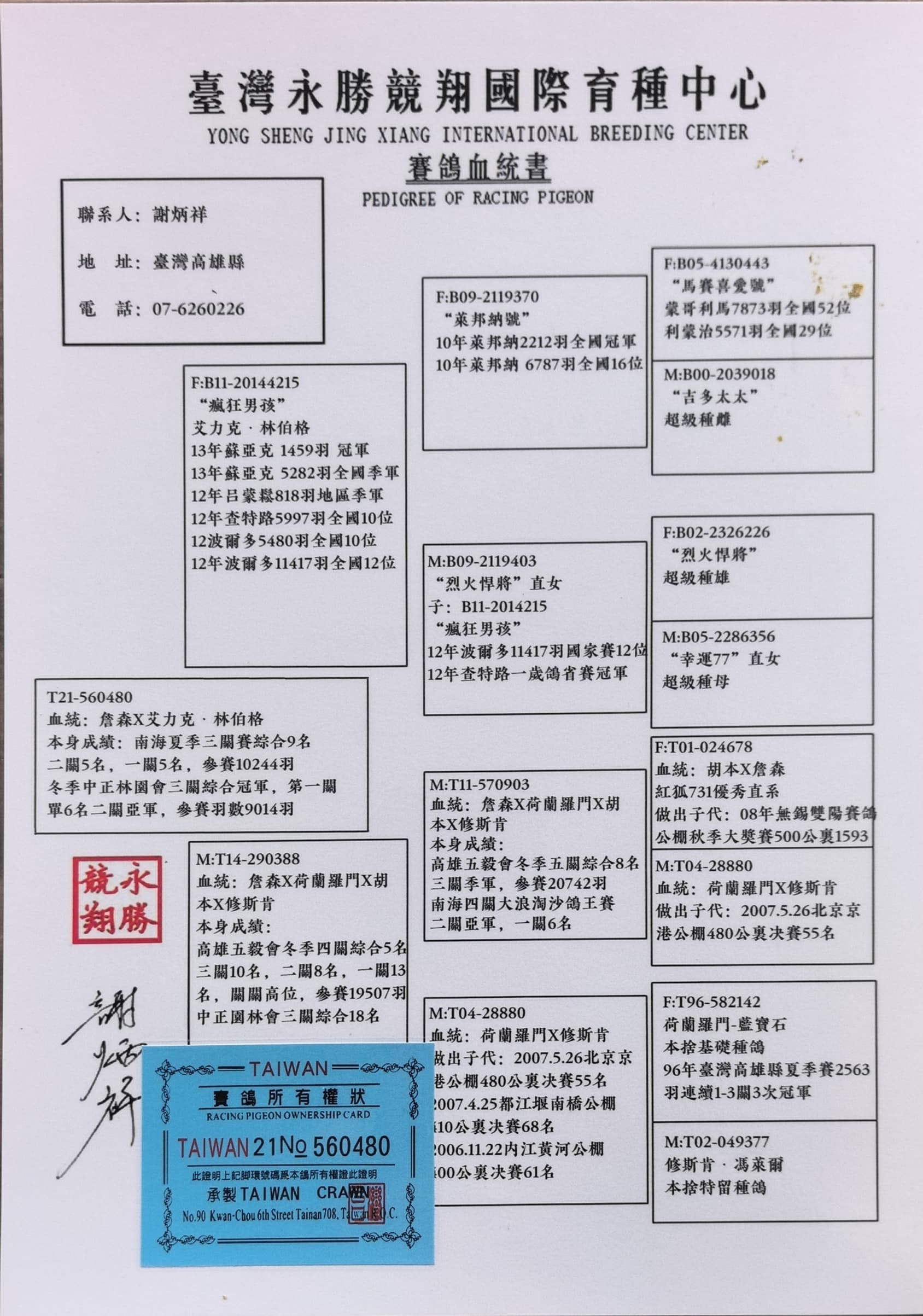 | 1610875 | 飛事達競翔研究中心 詹森血系 | ¥200元 | 1次 |