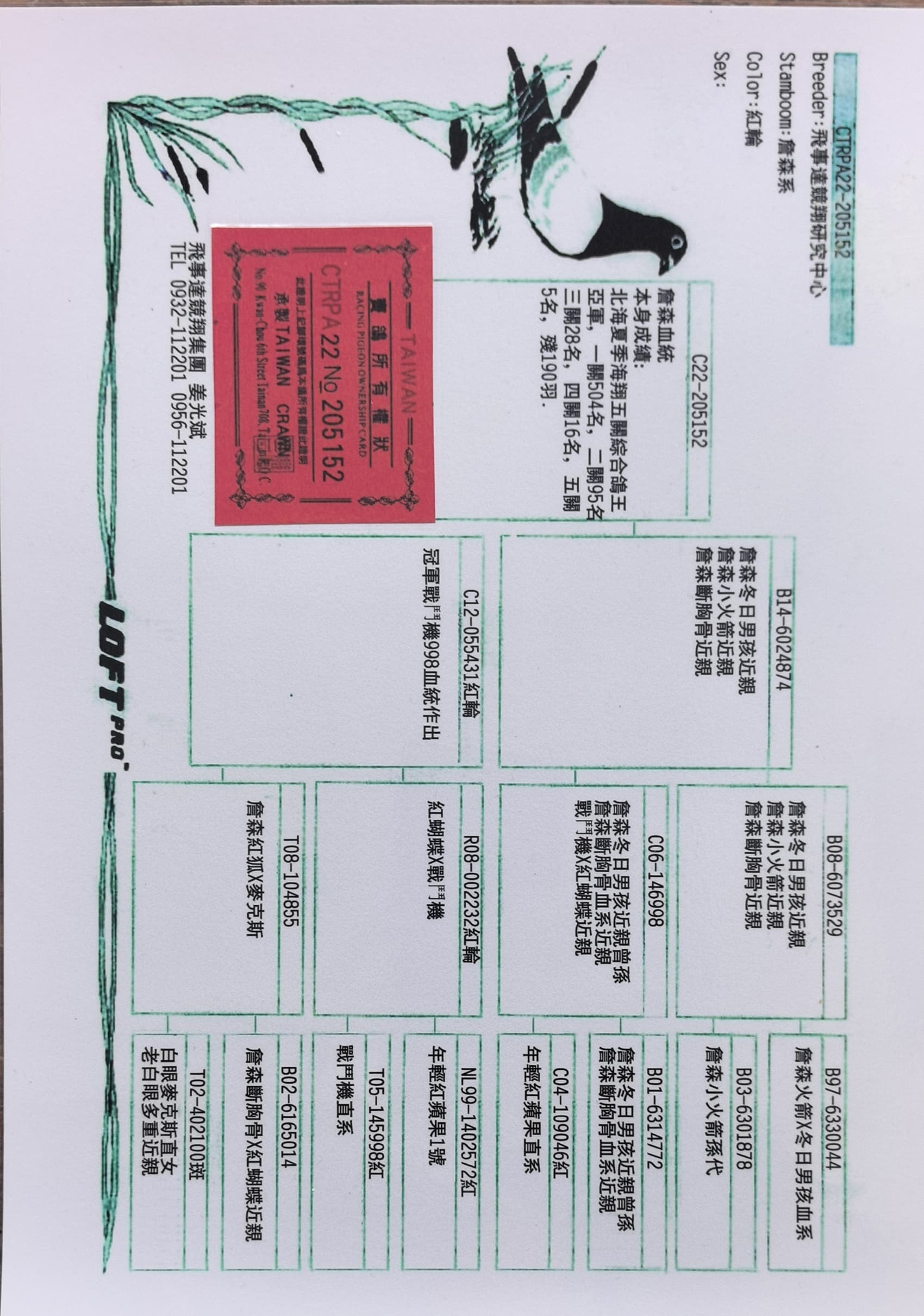 - 当前查看拍卖鸽:台湾飛事連竟翔詹森血系