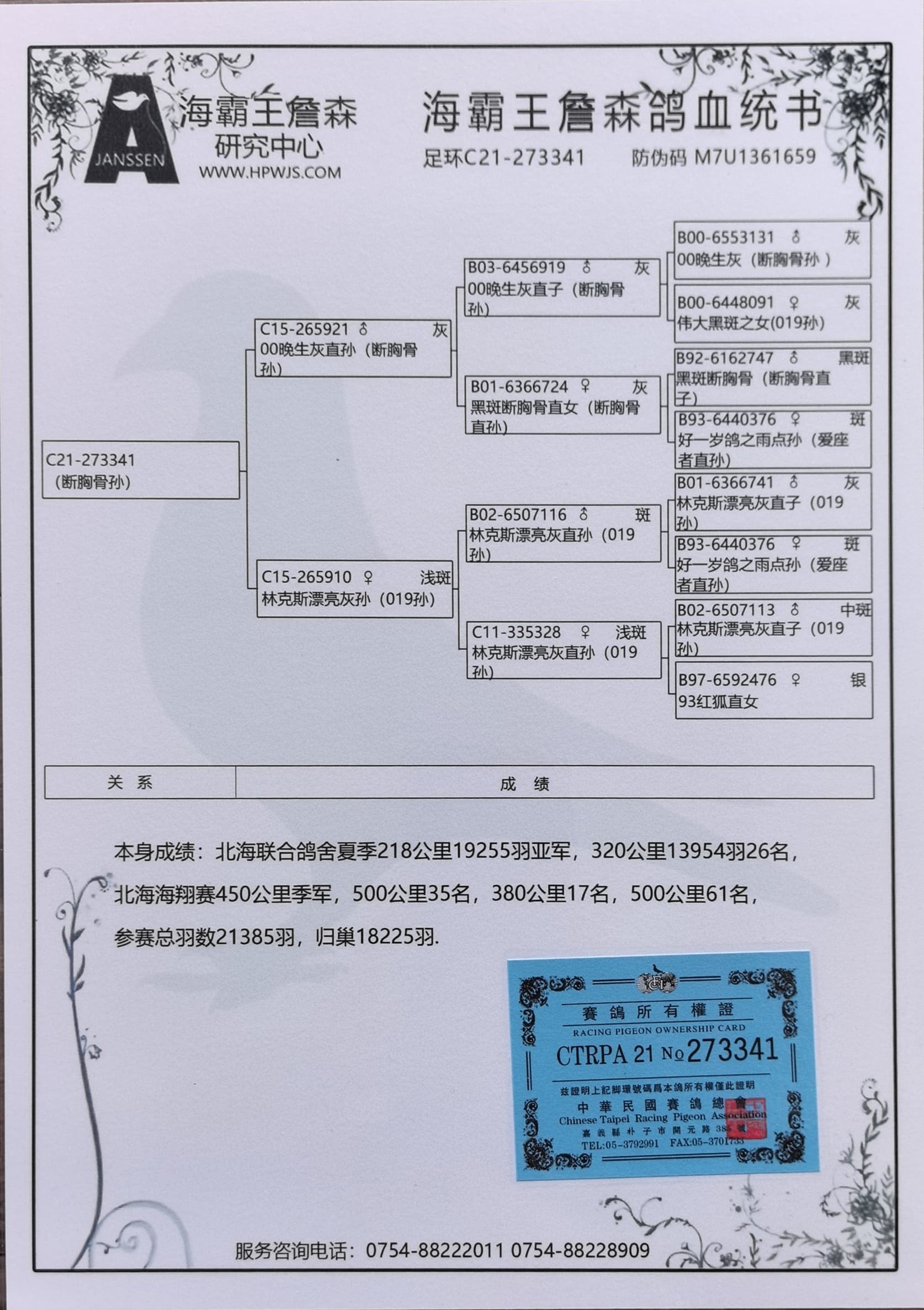 | 1610875 | 飛事達競翔研究中心 詹森血系 | ¥200元 | 1次 |