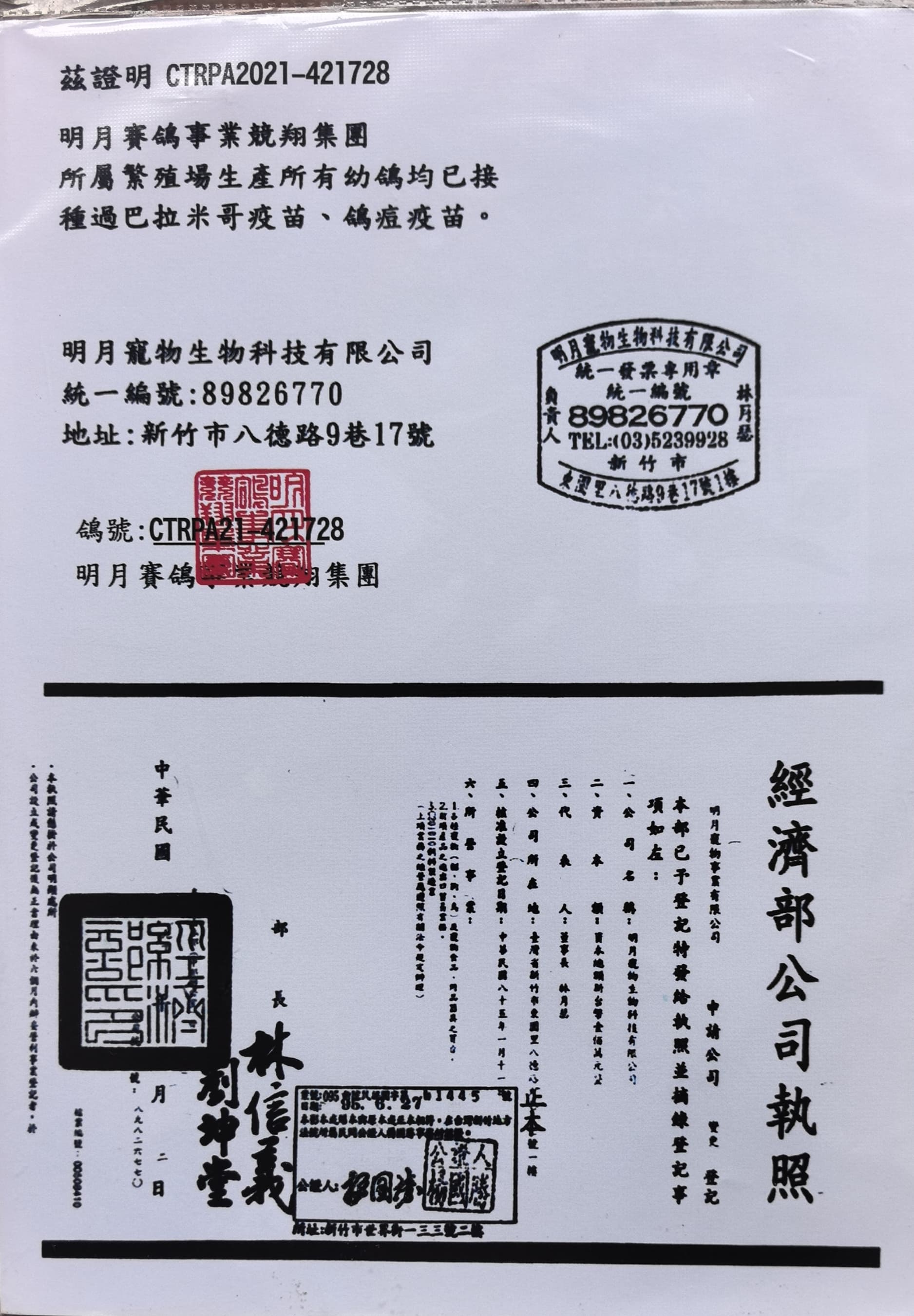 | 1610908 | 臺灣飛鸿賽鸽競翔集團作育本身成绩三关亚军 | ¥200元 | 1次 |