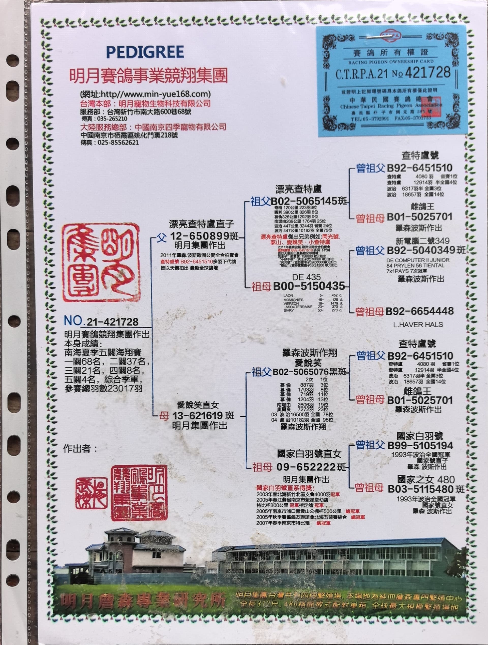 | 1610875 | 飛事達競翔研究中心 詹森血系 | ¥200元 | 1次 |